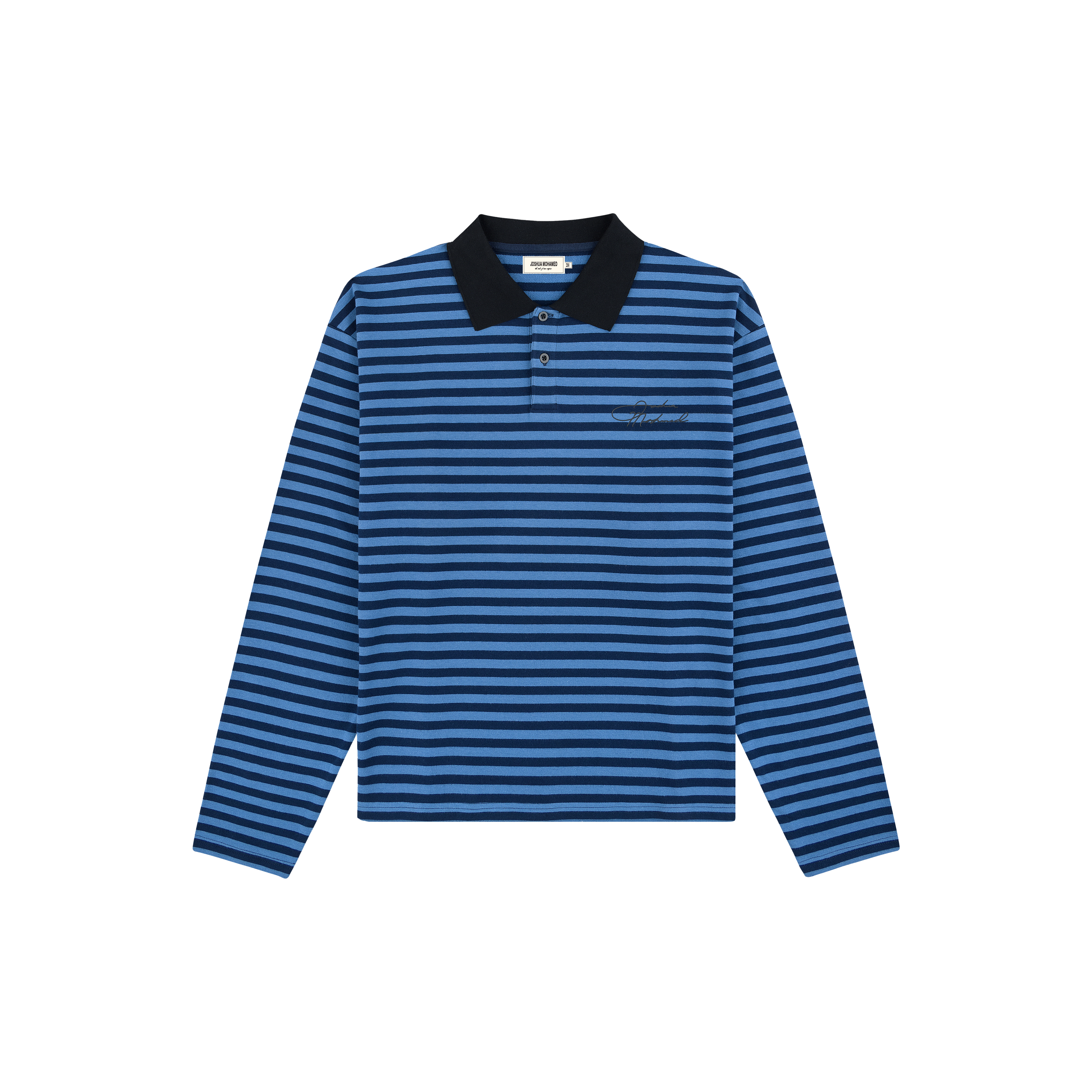 The blue striped polo shirt features two front buttons on the collar and a printed signature logo on the front left chest. Constructed from 95% cotton 5% elastane.