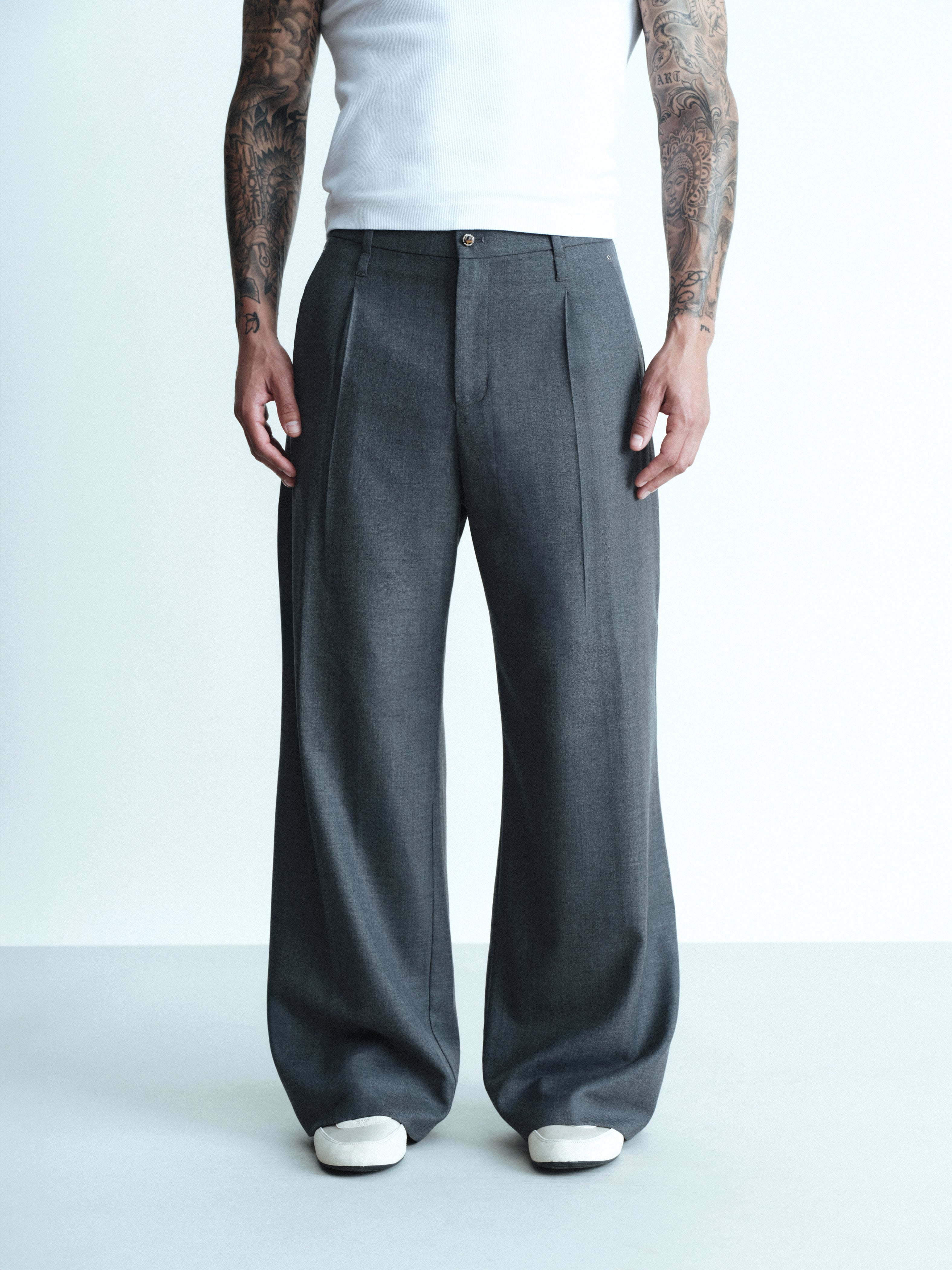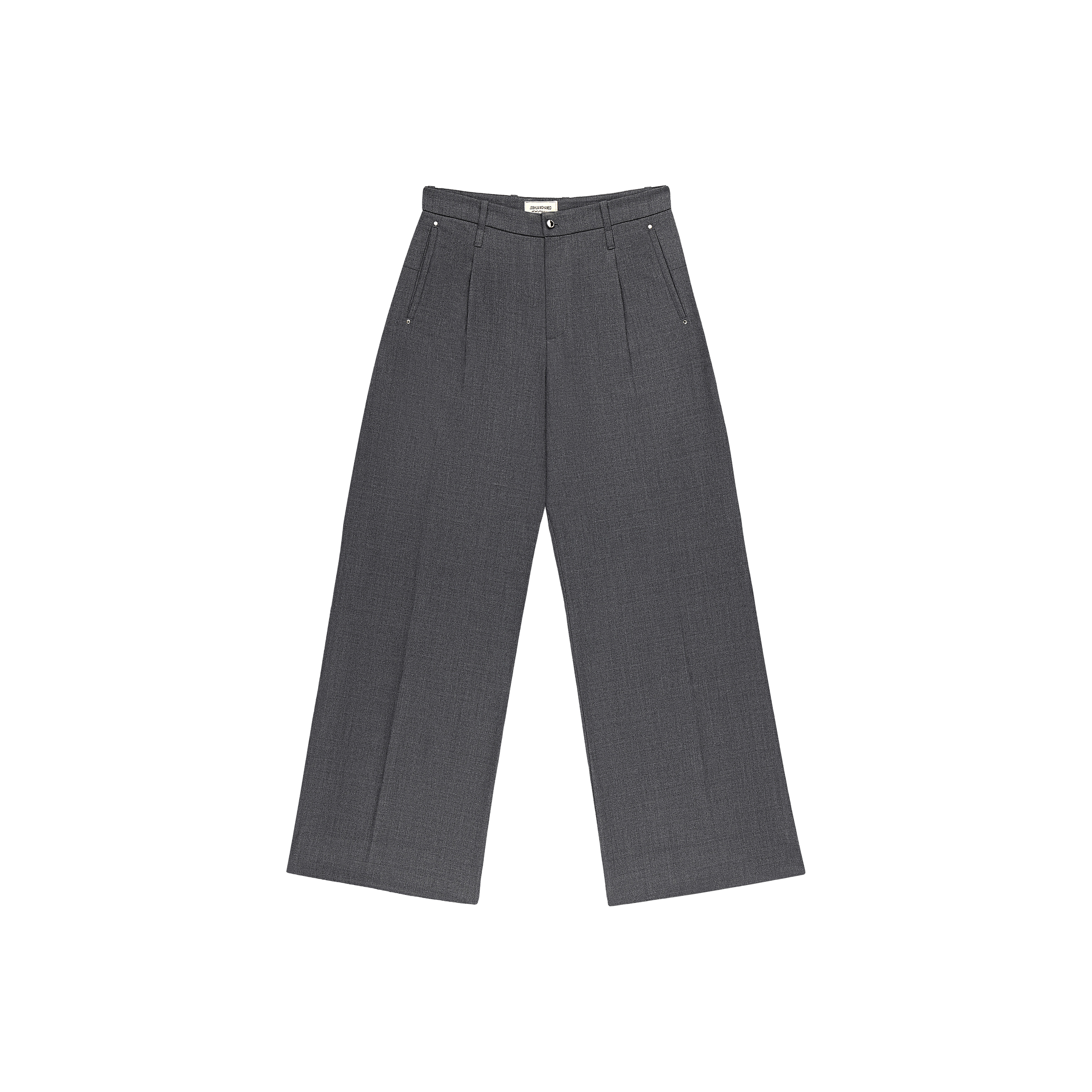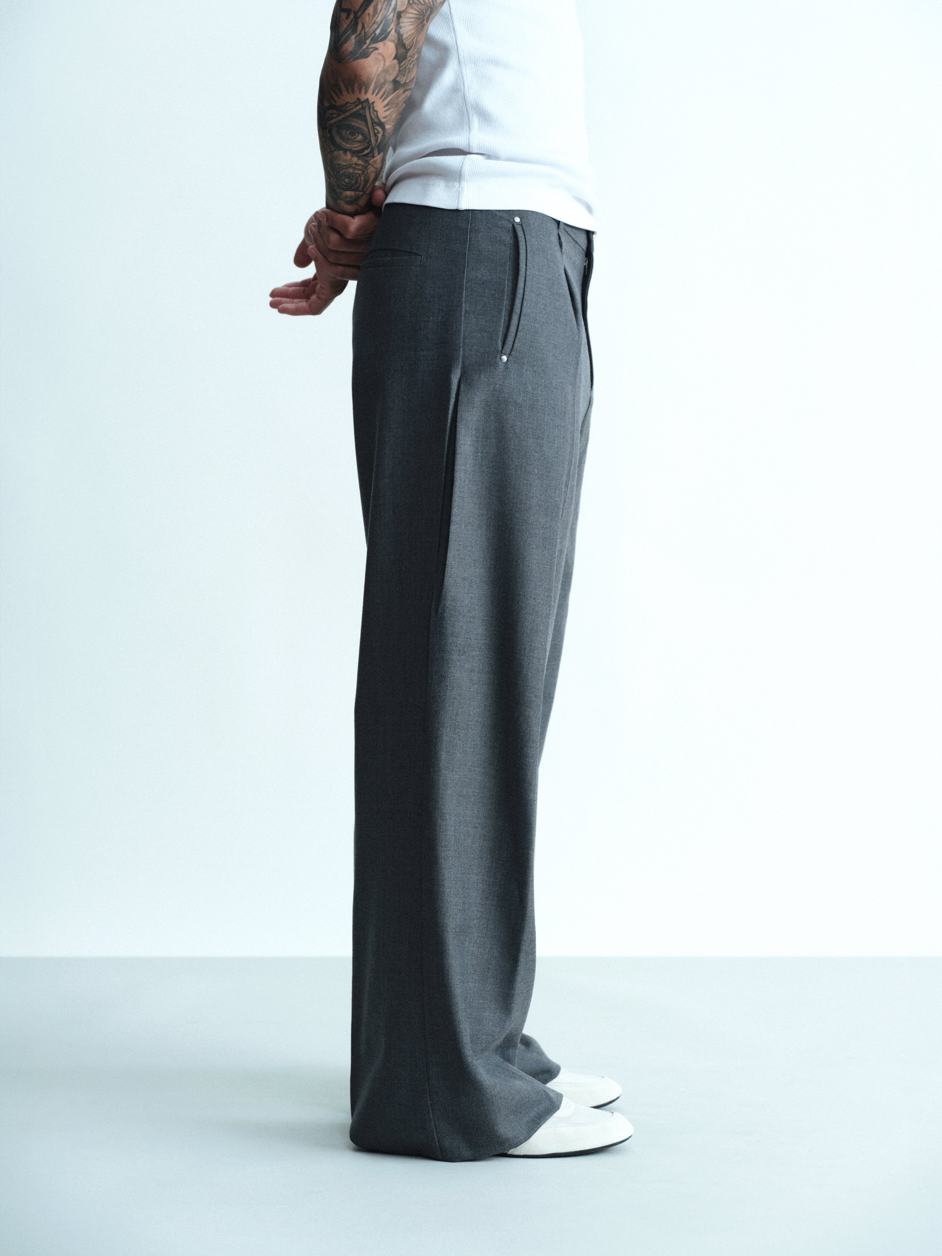 Wide leg wool-blend trousers designed with a relaxed, tailored drape. This pant features front and side pleat details for added structure and movement. Finished with a custom JOSHUA MOHAMED main button, front zip closure, and subtle silver studs at the front pockets for a refined edge. Constructed from a premium wool-blend fabric.