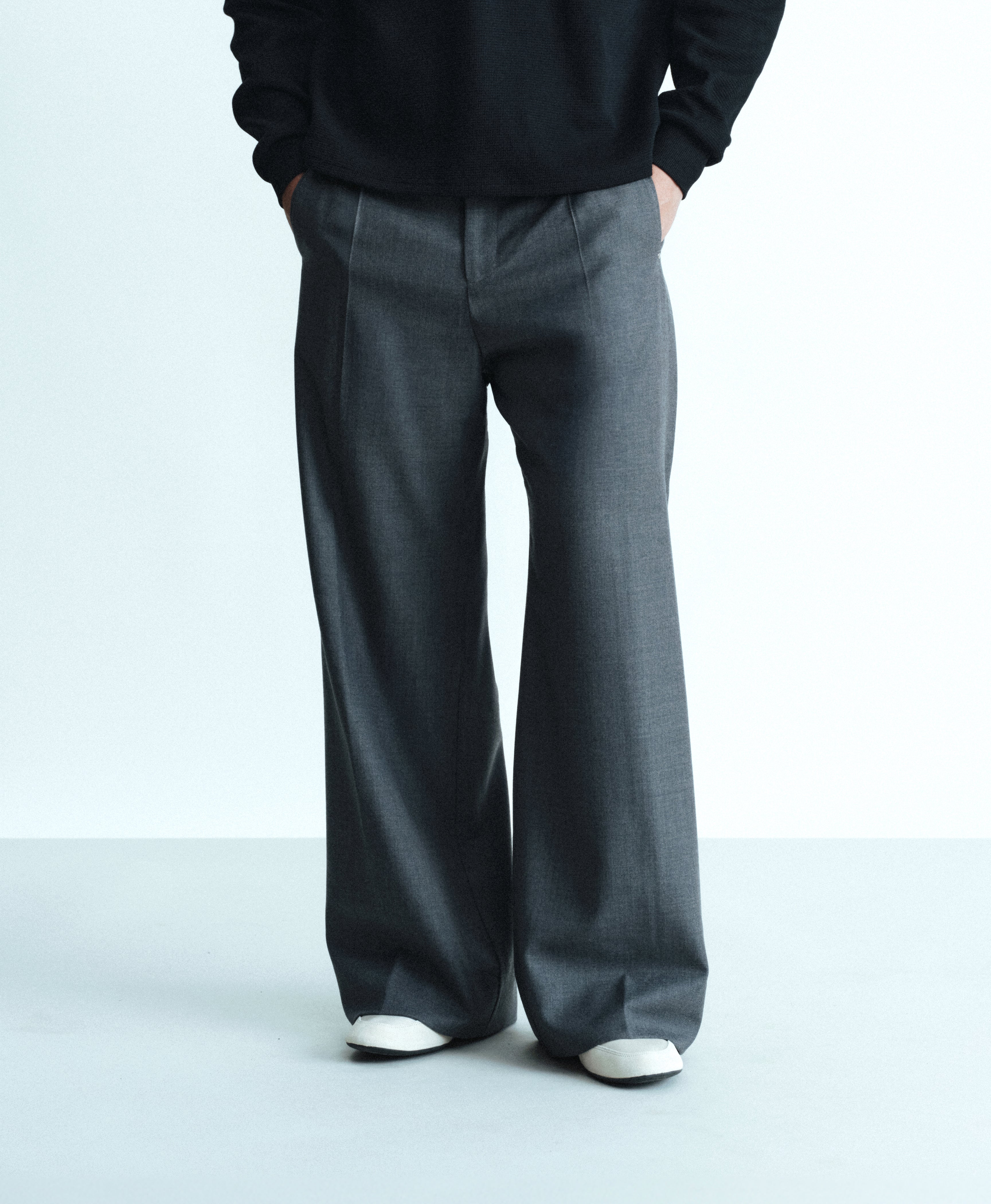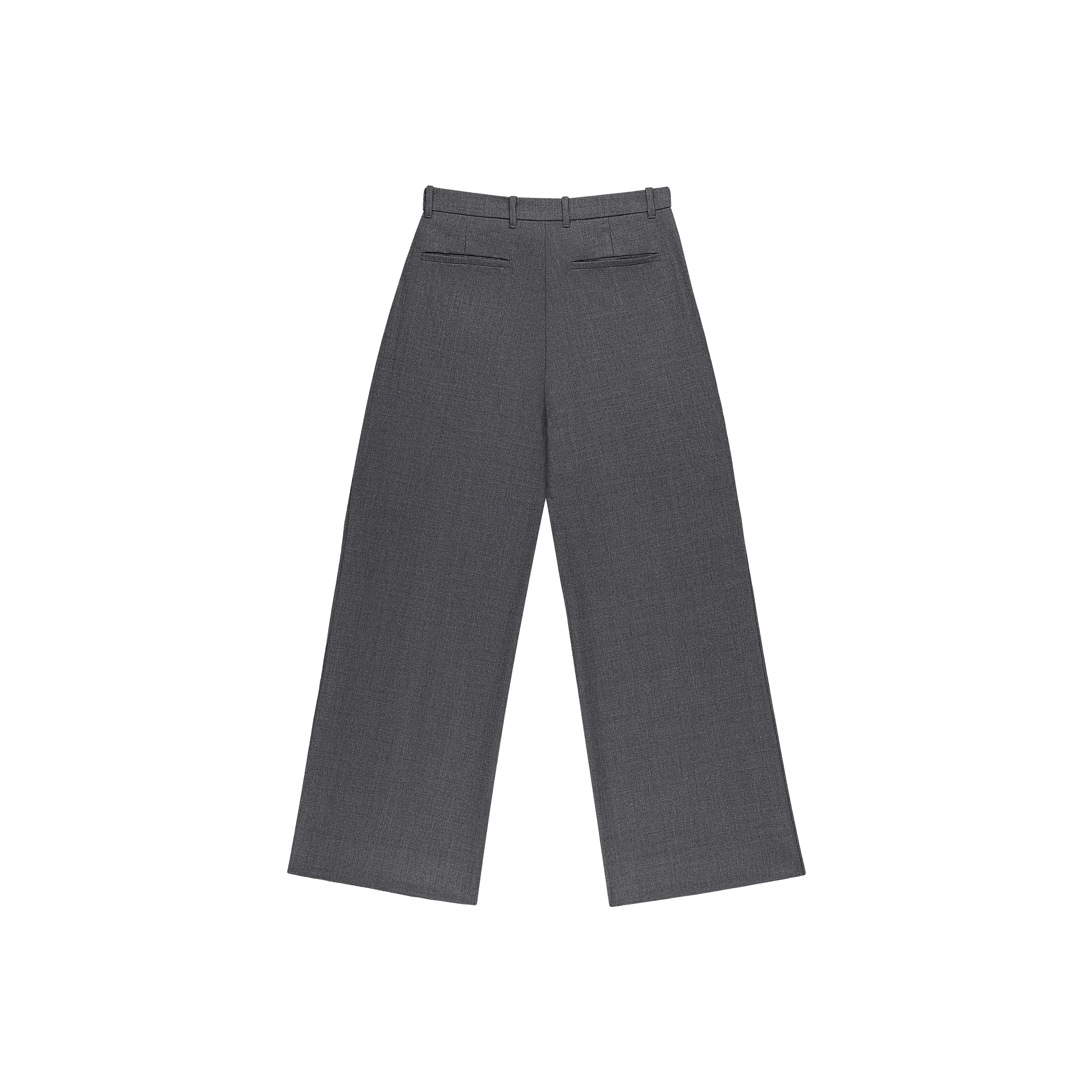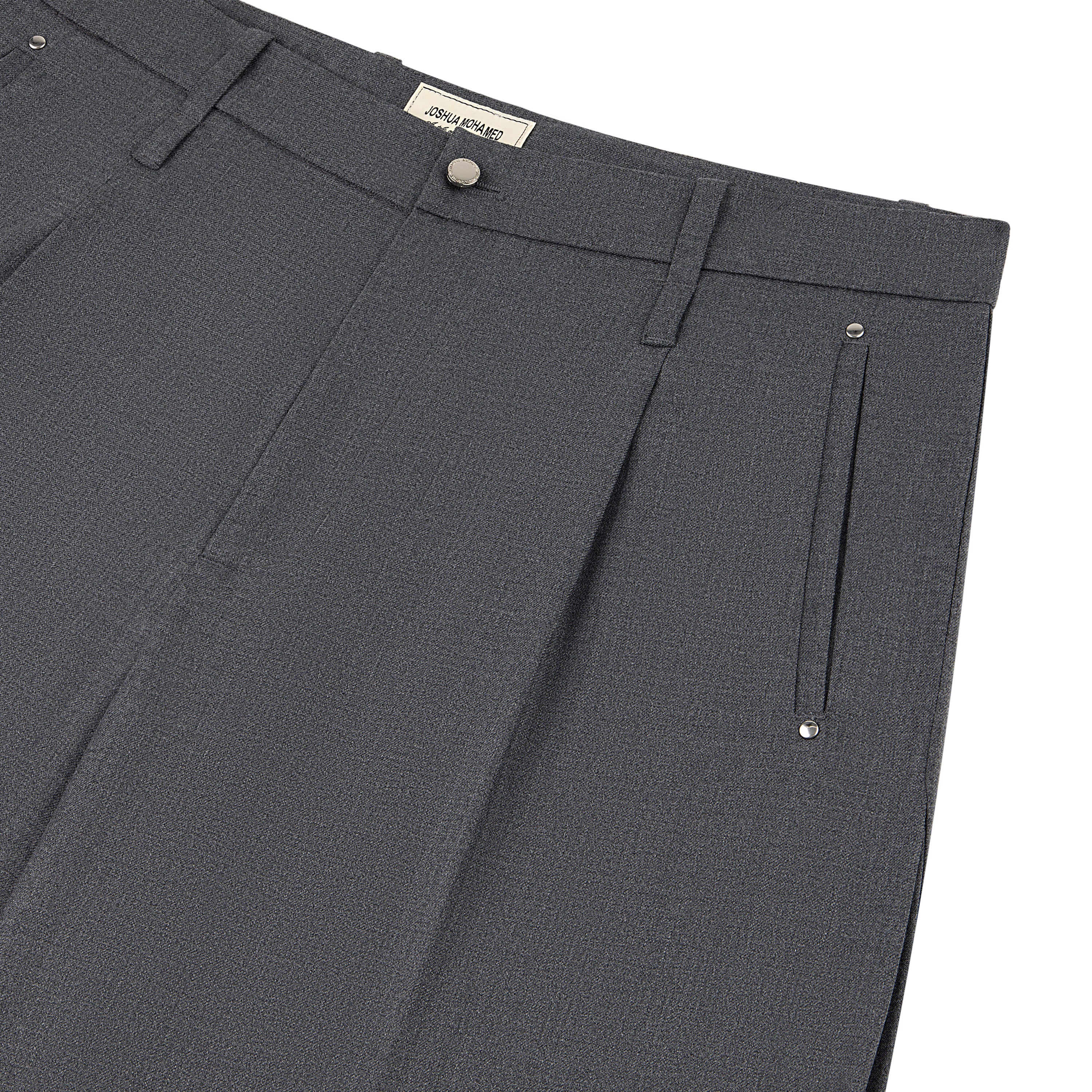 Wide leg wool-blend trousers designed with a relaxed, tailored drape. This pant features front and side pleat details for added structure and movement. Finished with a custom JOSHUA MOHAMED main button, front zip closure, and subtle silver studs at the front pockets for a refined edge. Constructed from a premium wool-blend fabric.