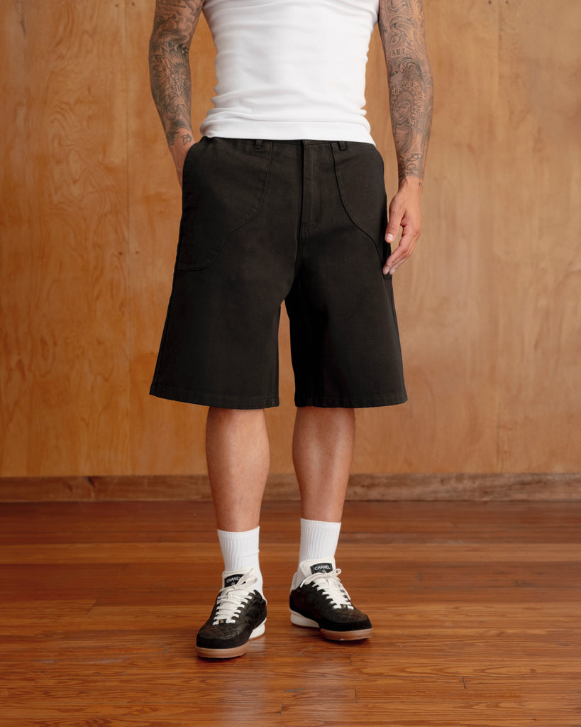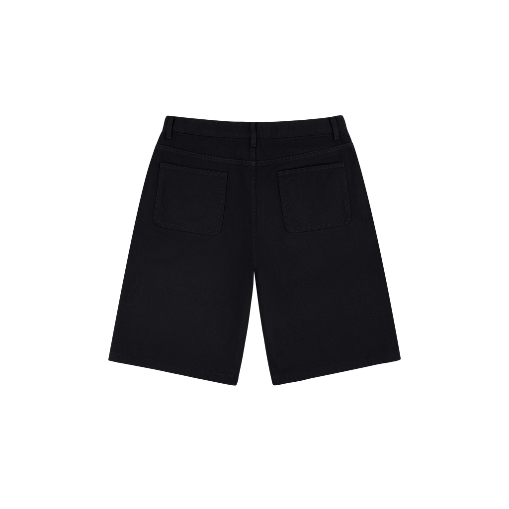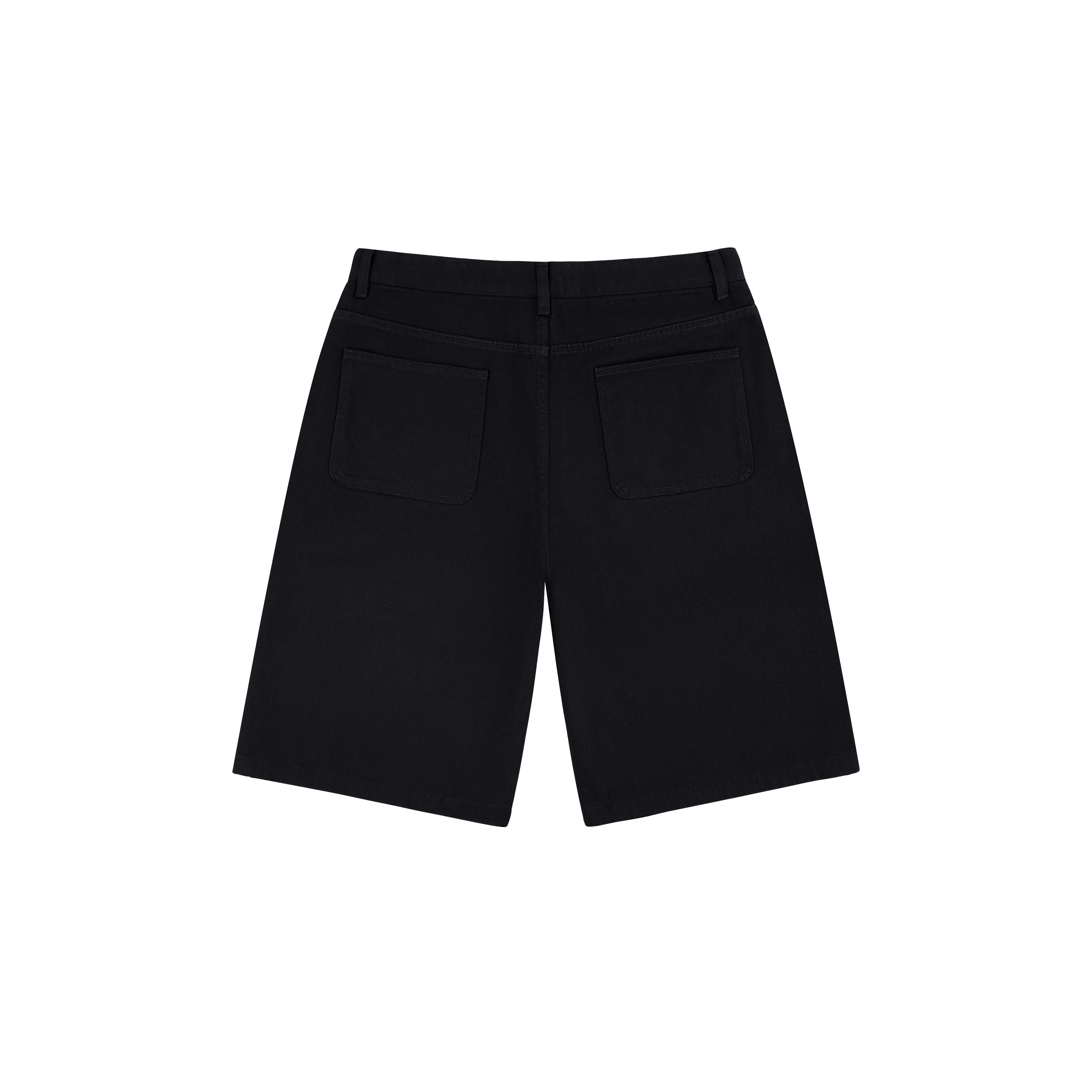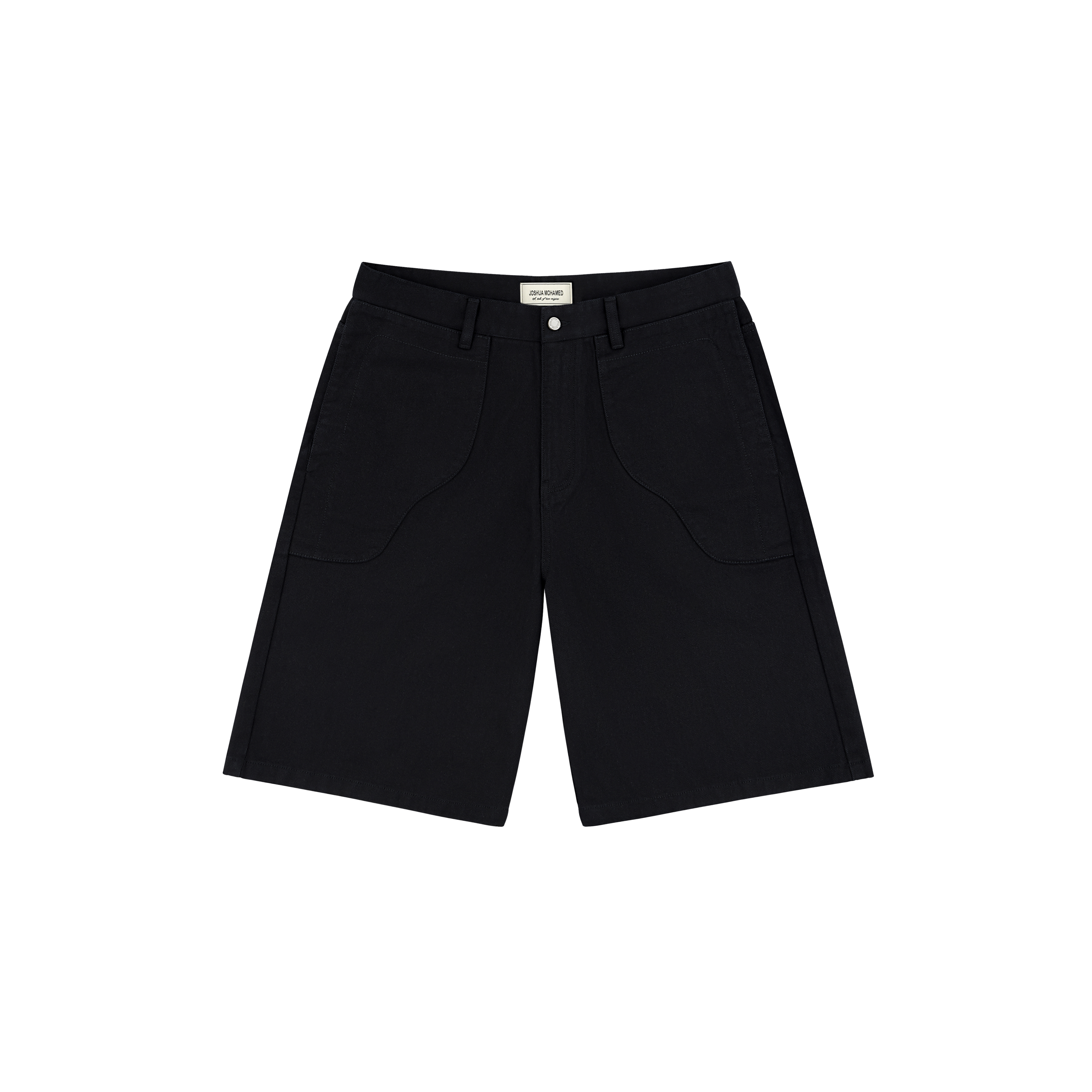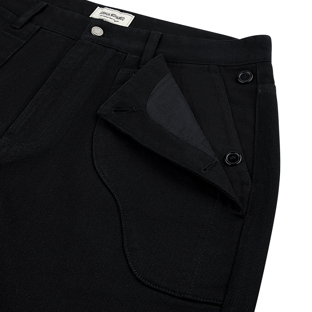 Constructed from 100% cotton twill, the black layered pocket shorts feature a front layered pocket design and custom Joshua Mohamed button closure.