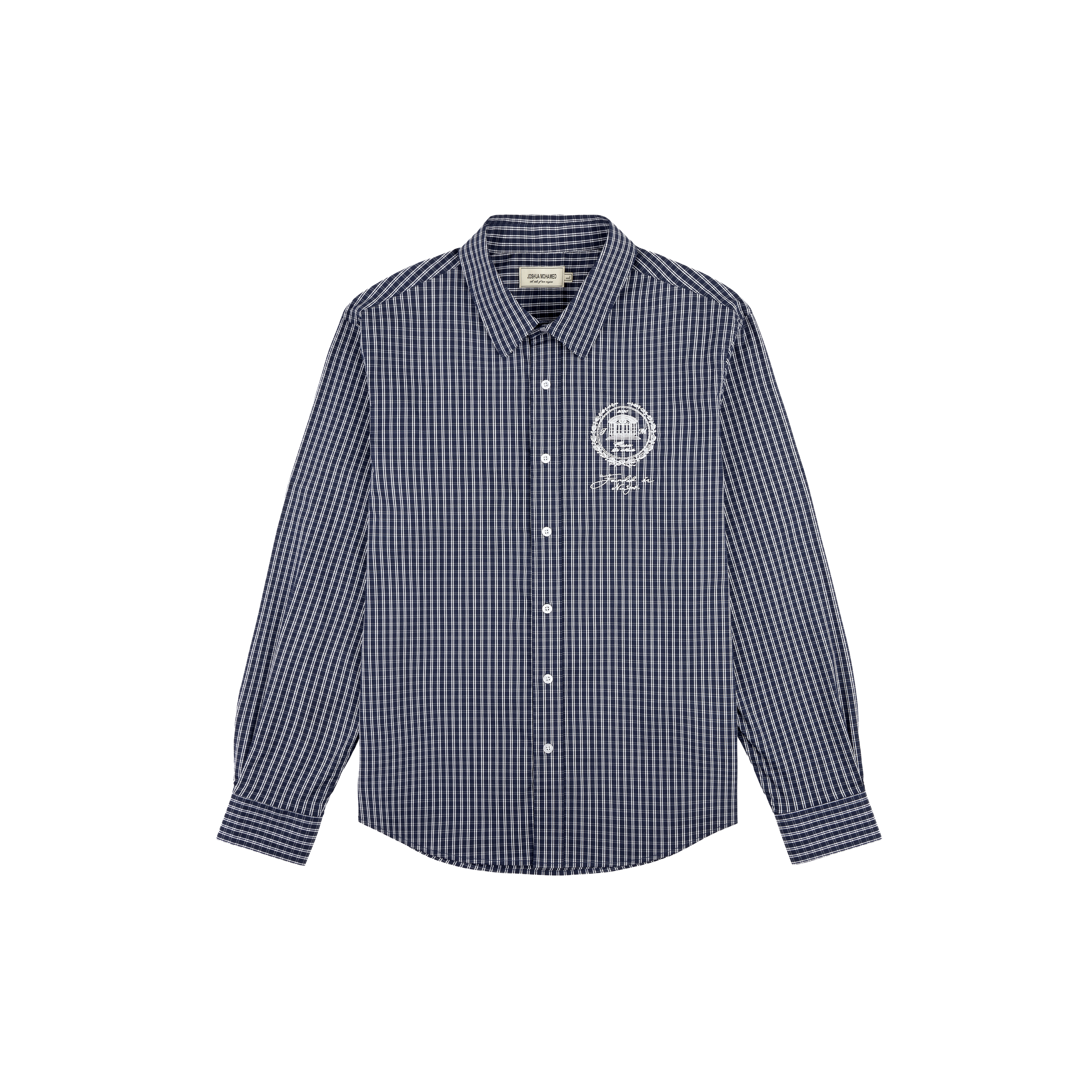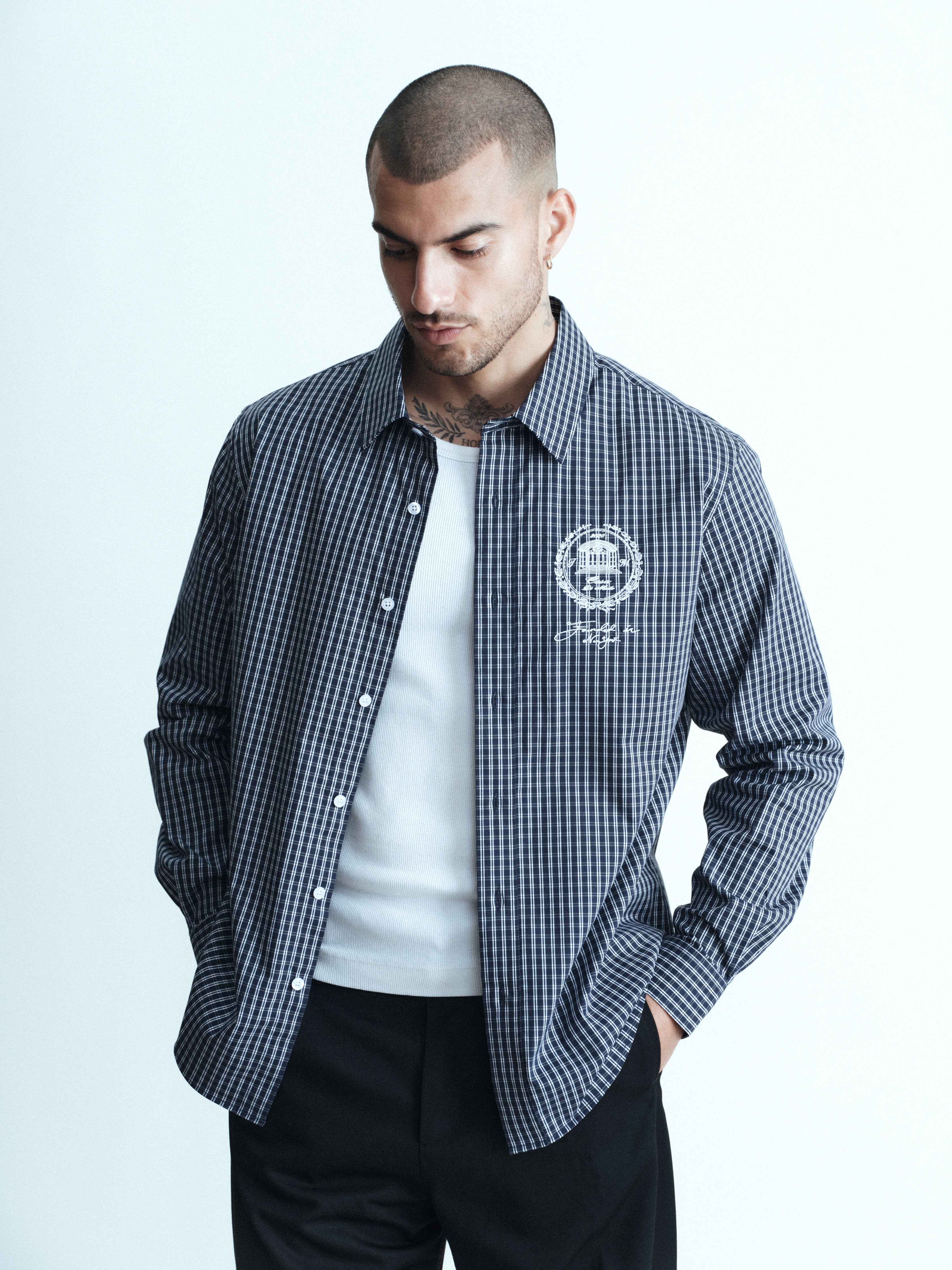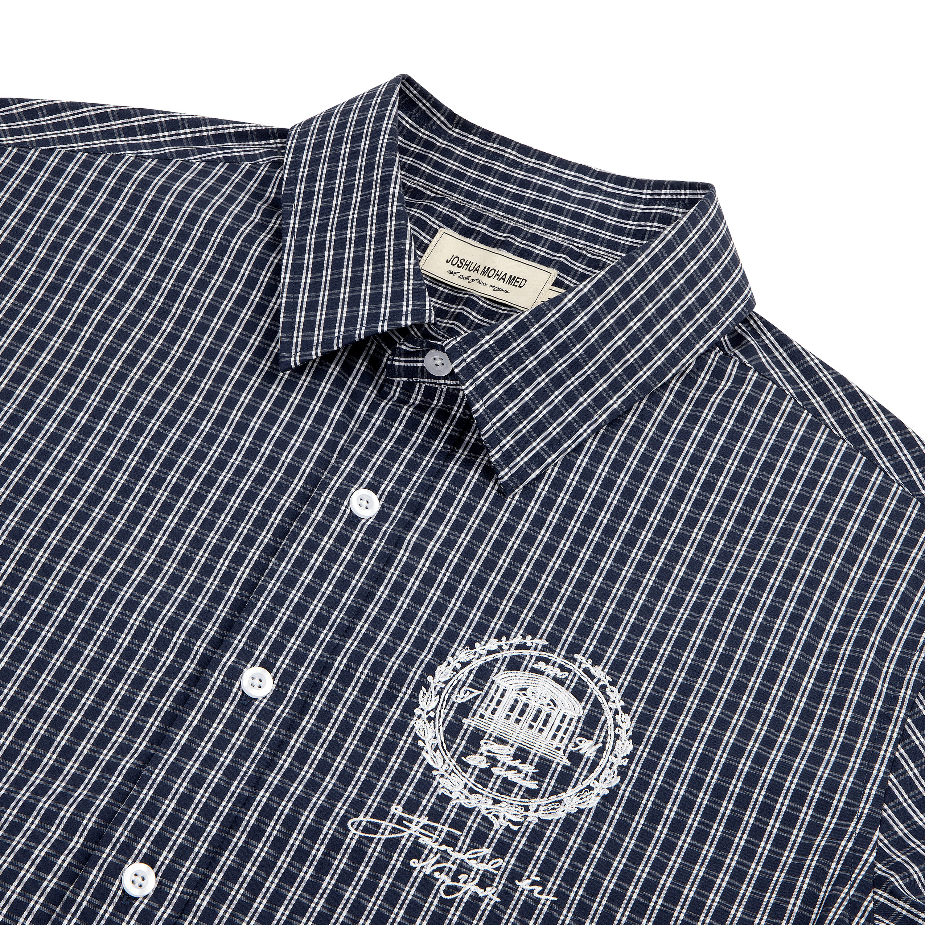 A Double-layered checked collared shirt featuring a spread collar, button-through placket, a JOSHUA MOHAMED embroidery crest logo design at the left chest and a rounded hem finish. Constructed from 100% cotton.
