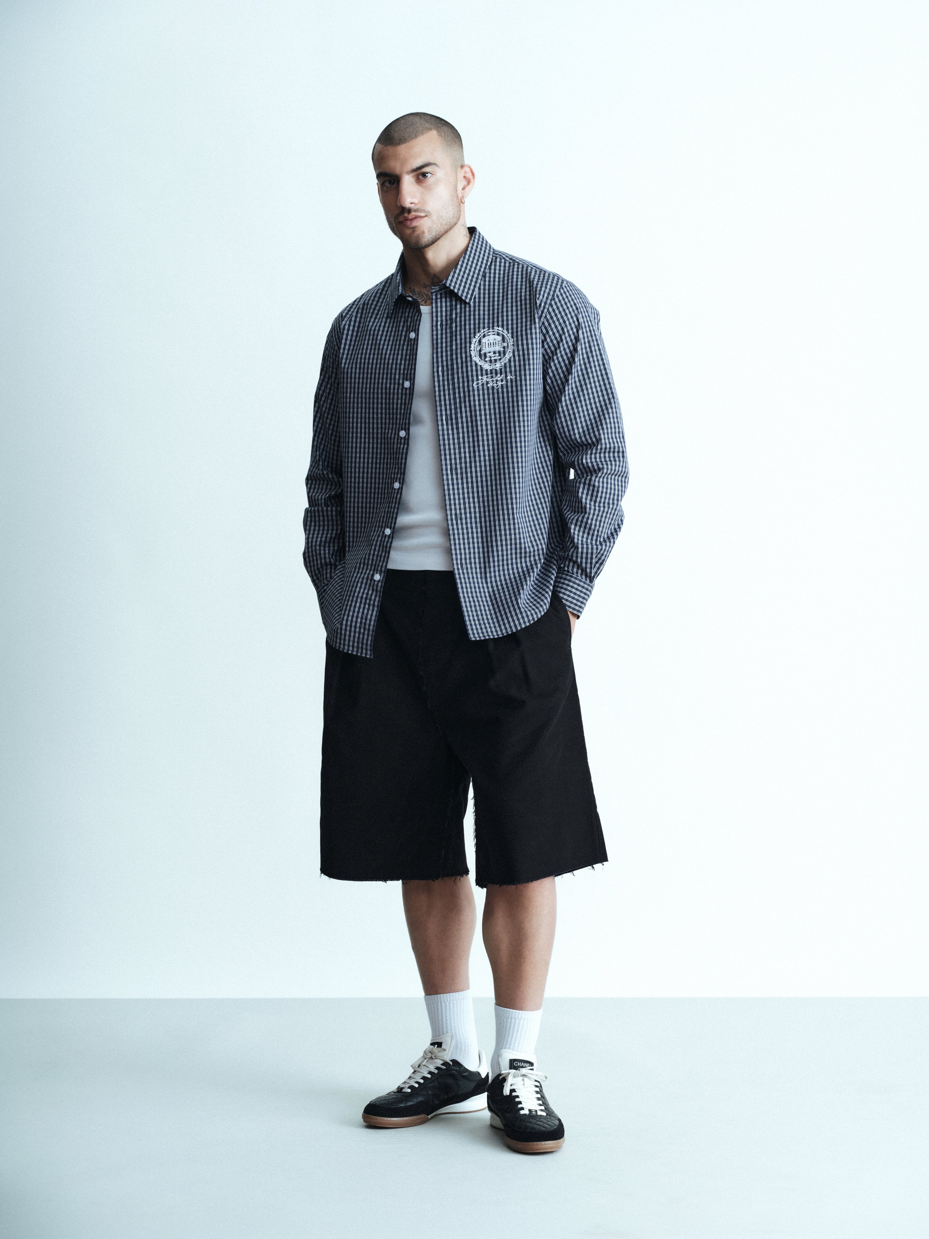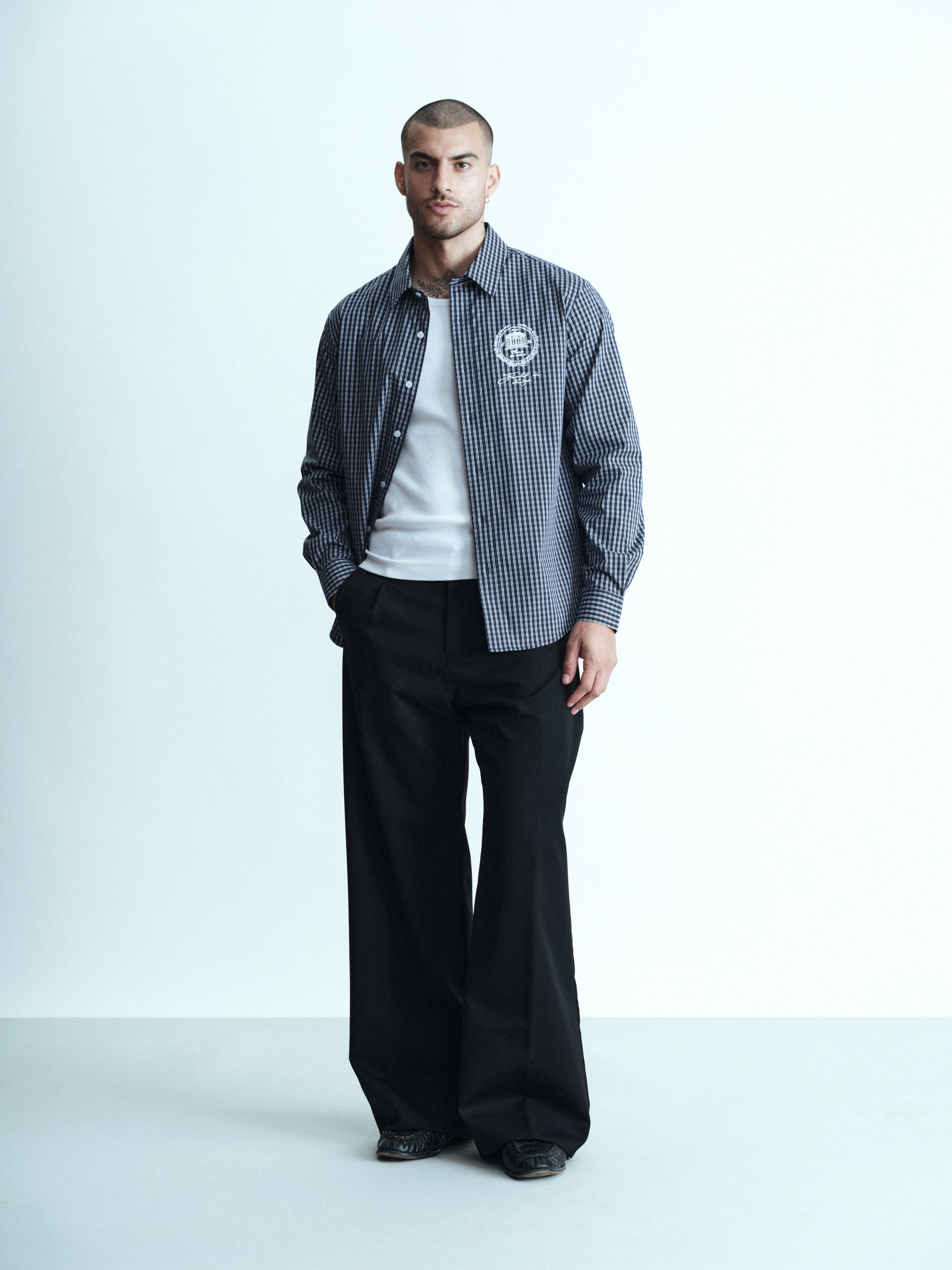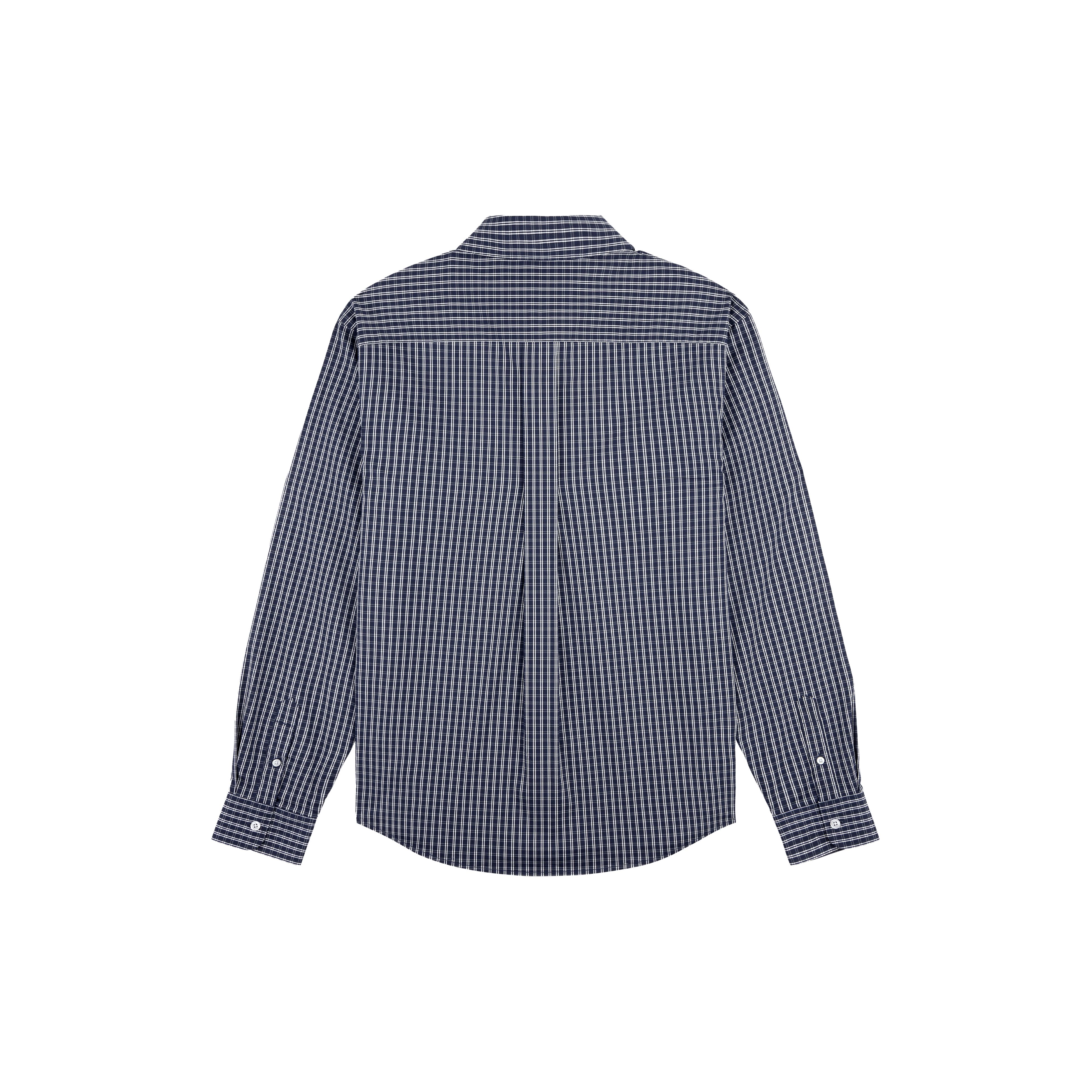 A Double-layered checked collared shirt featuring a spread collar, button-through placket, a JOSHUA MOHAMED embroidery crest logo design at the left chest and a rounded hem finish. Constructed from 100% cotton.