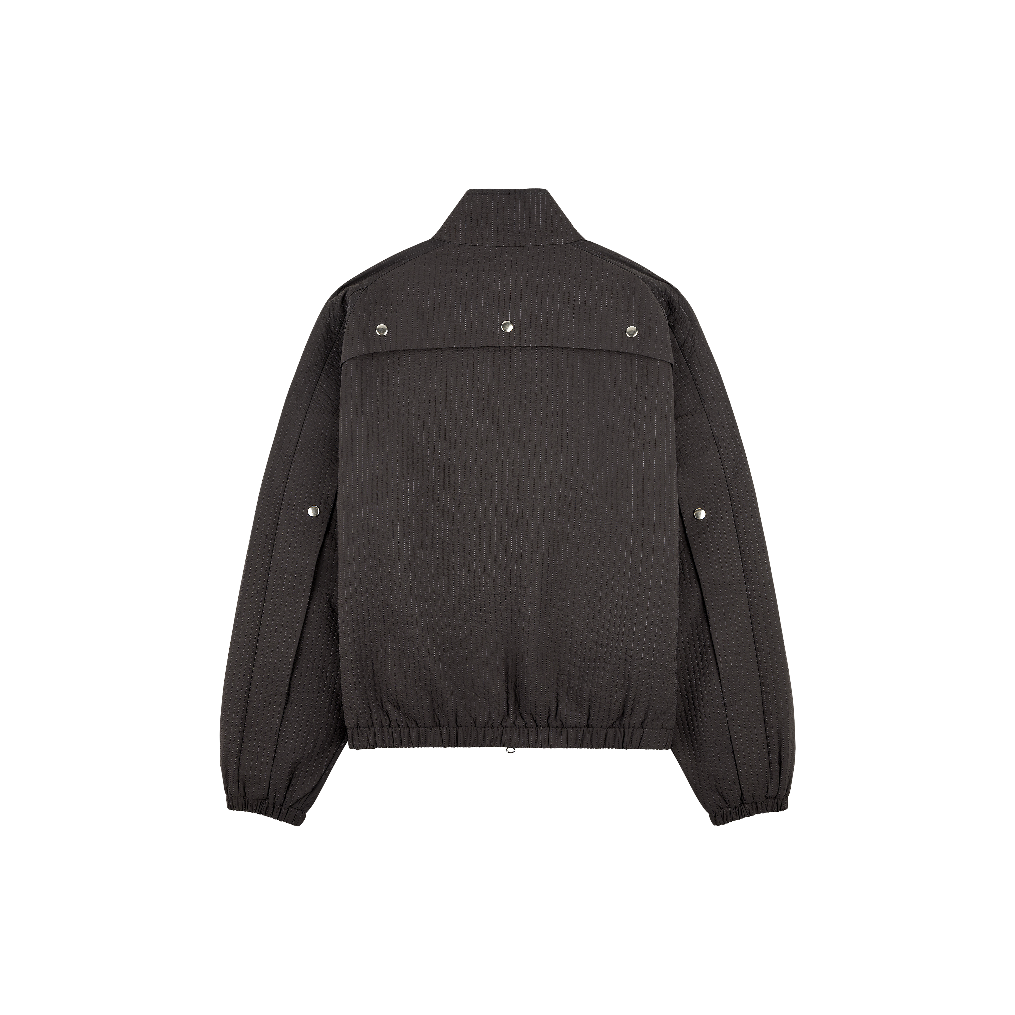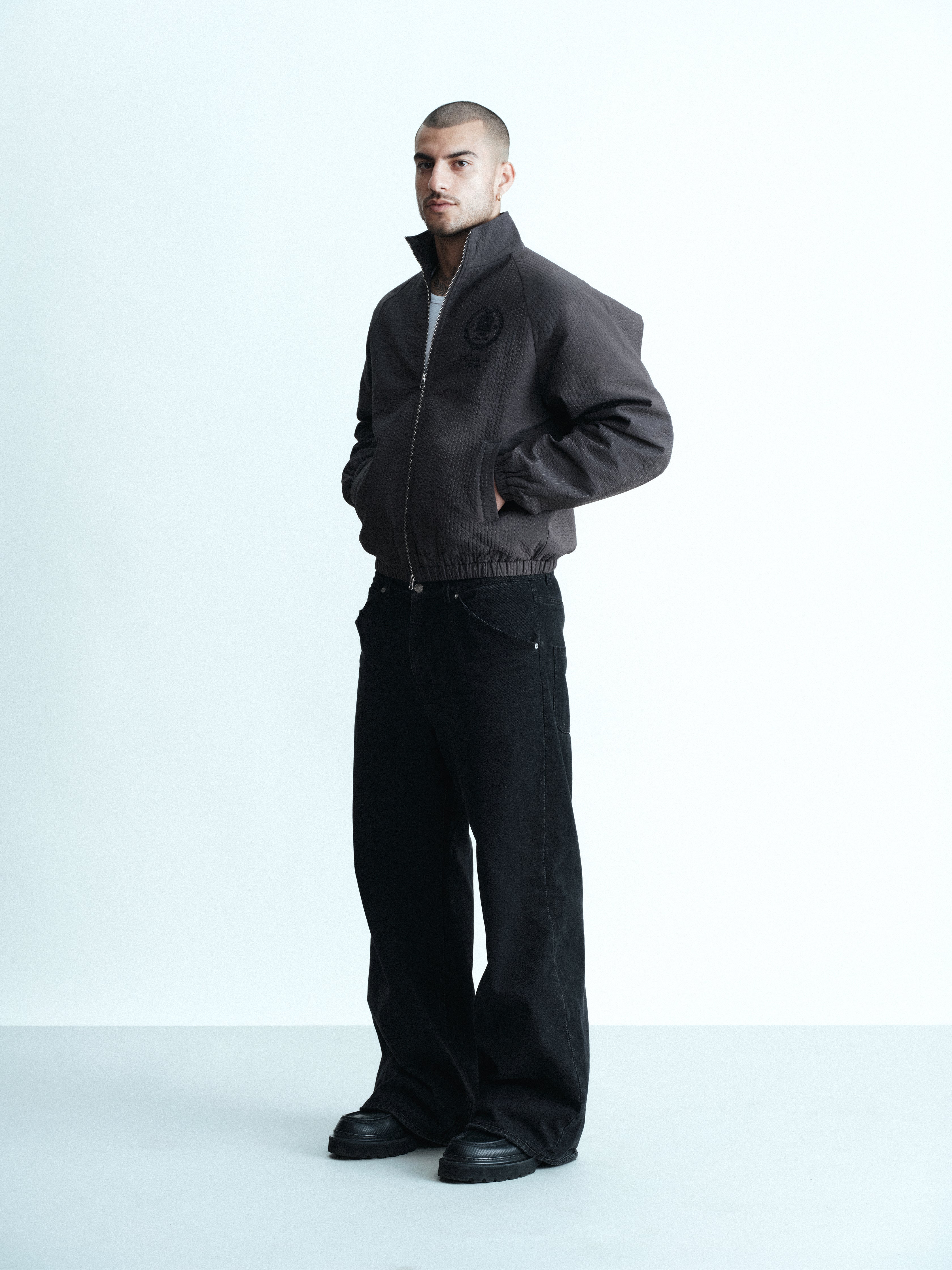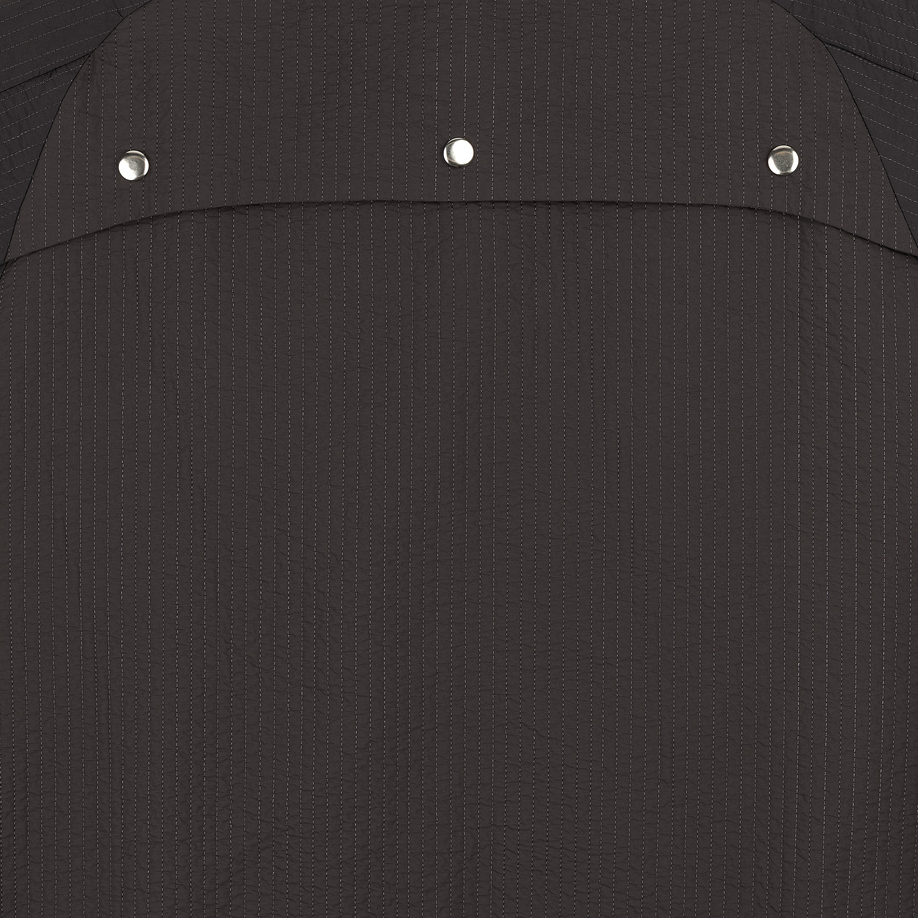 A lightweight quilted jacket constructed from 100% nylon with light padding, finished with a raglan sleeve design and subtle technical detailing. Features an embroidery chest logo, double-zip closure, elasticated cuffs and hem and a functional back vent with silver stud closures for added movement.