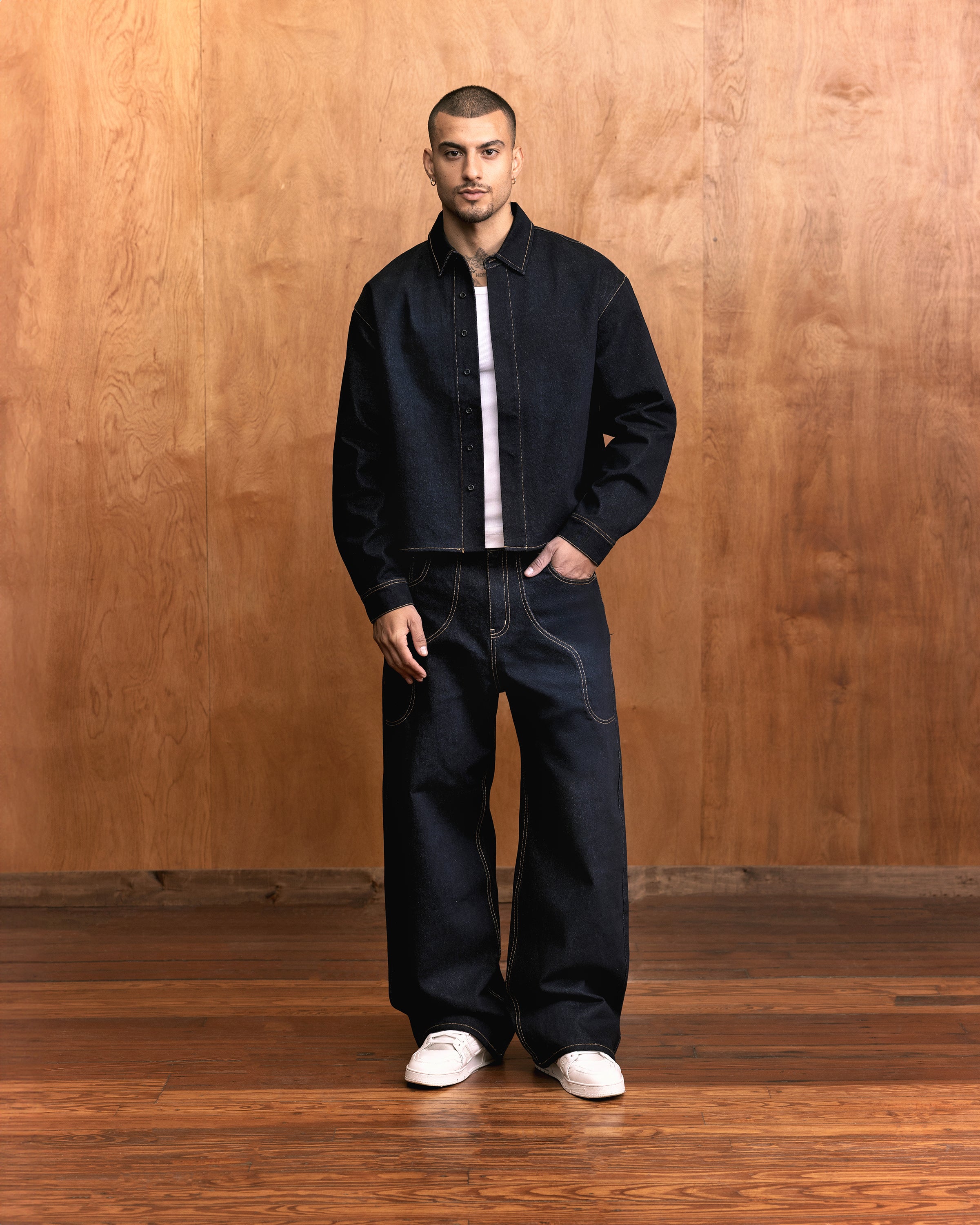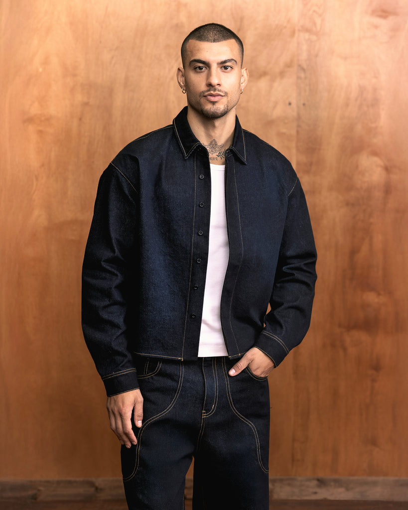 13oz Selvedge denim shirt with button closures, covered by a front flap and finished with contrast stitching throughout the garment.