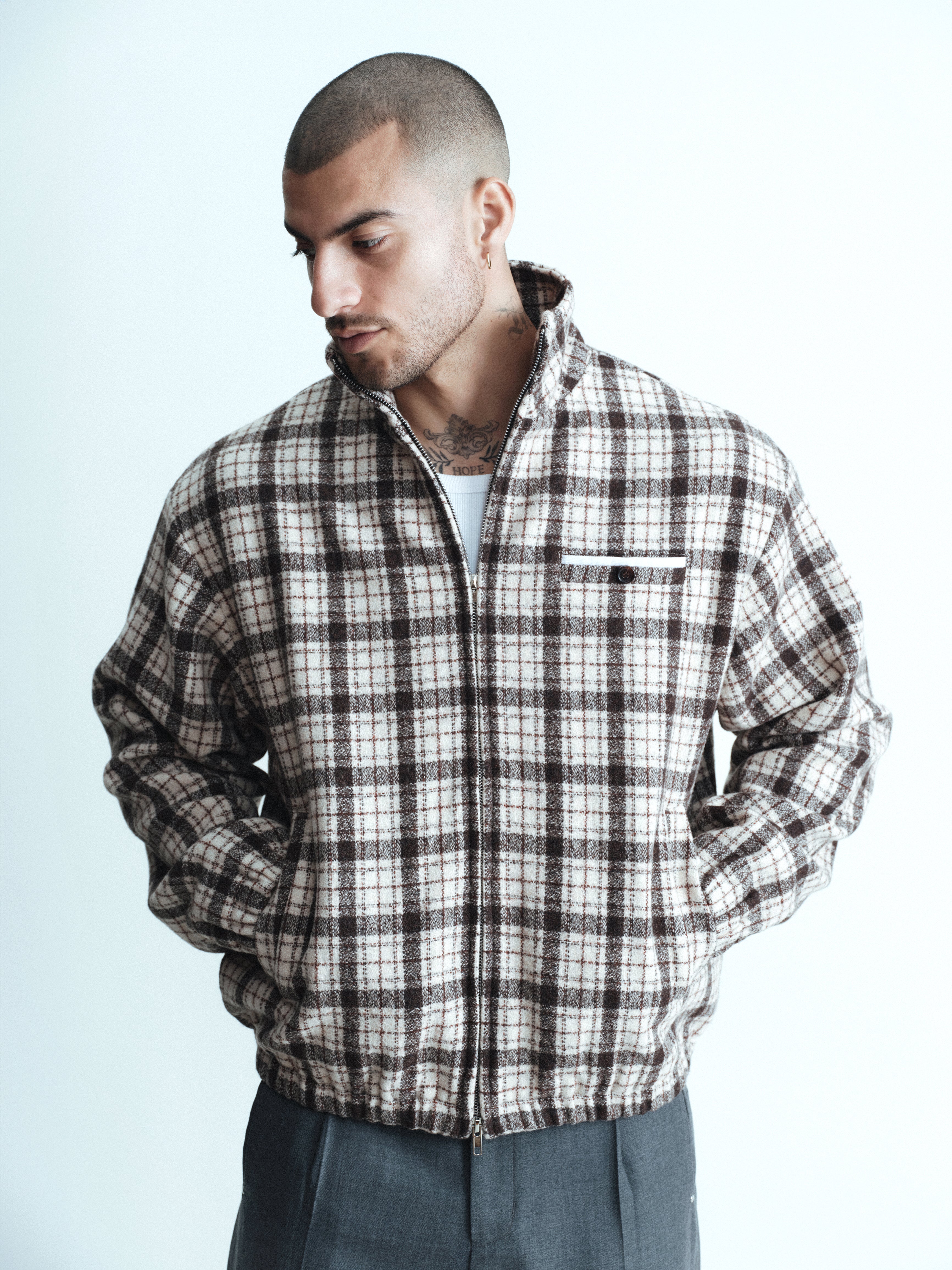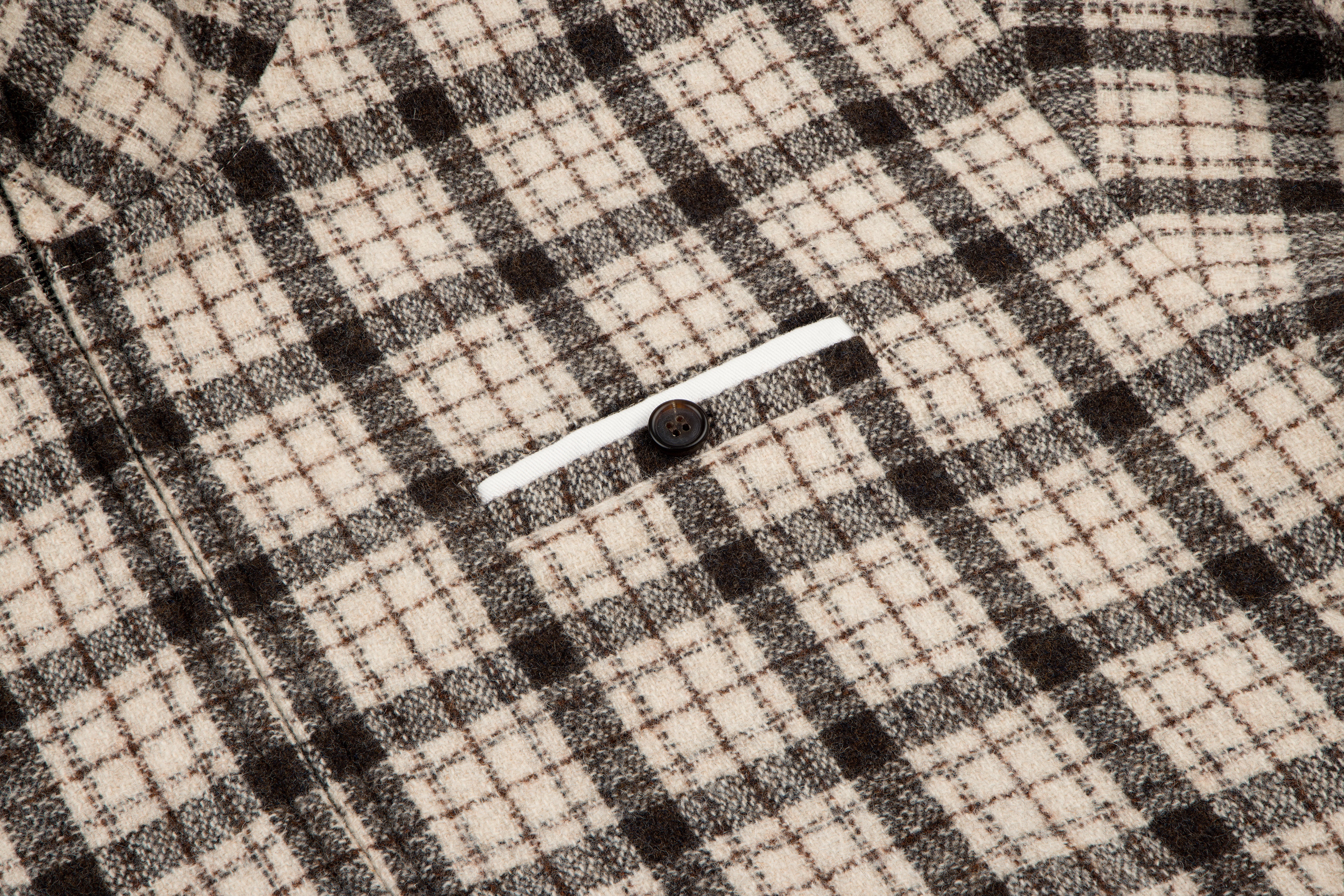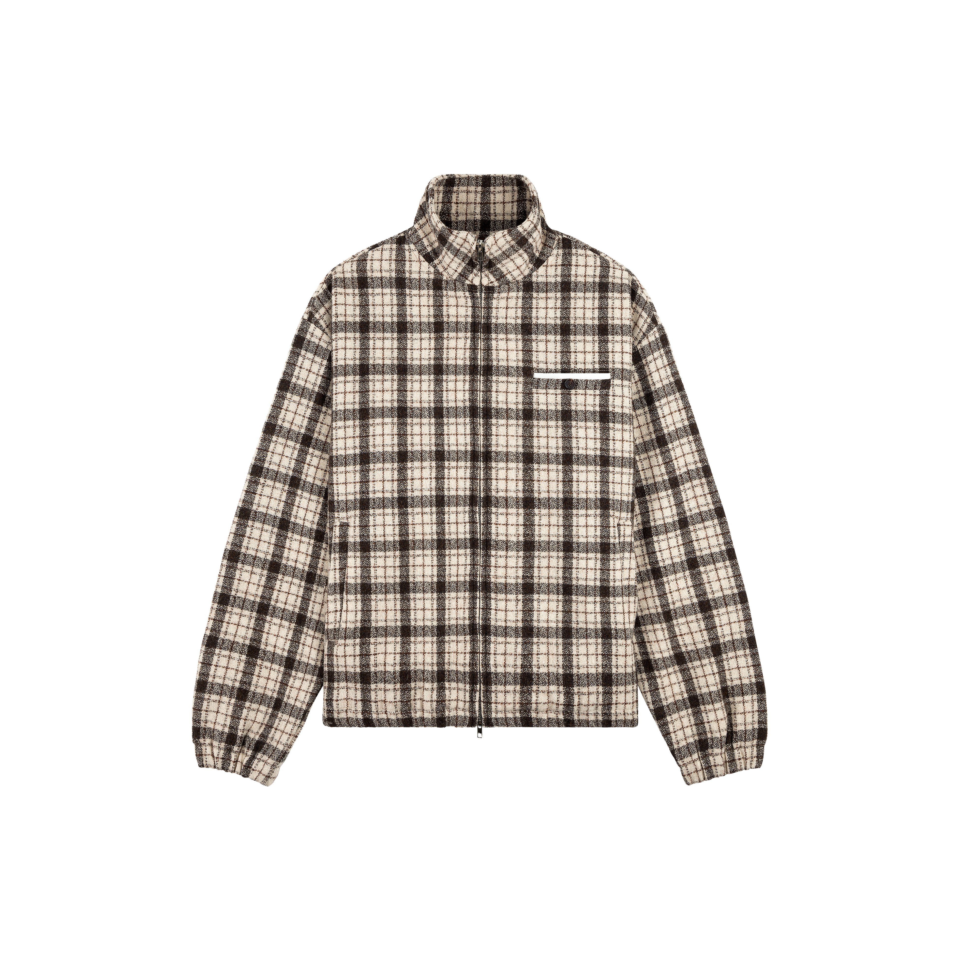 A 100% wool shell jacket in a tonal plaid, lined with a soft wool-viscose blend for a clean finish. Constructed with a double-layered collar, double-zip closure, elasticated cuffs and hem, two front pockets and a decorative chest pocket.