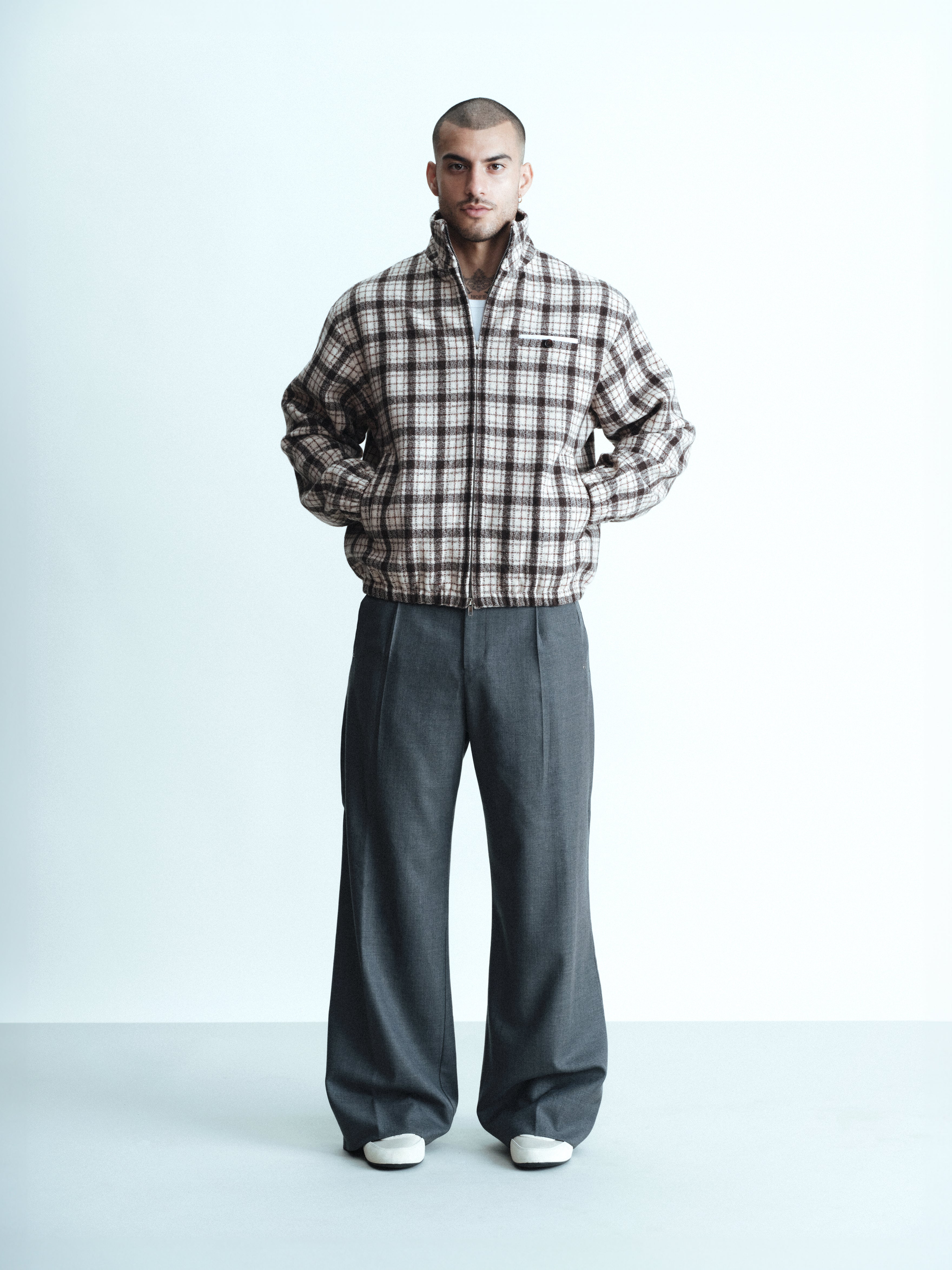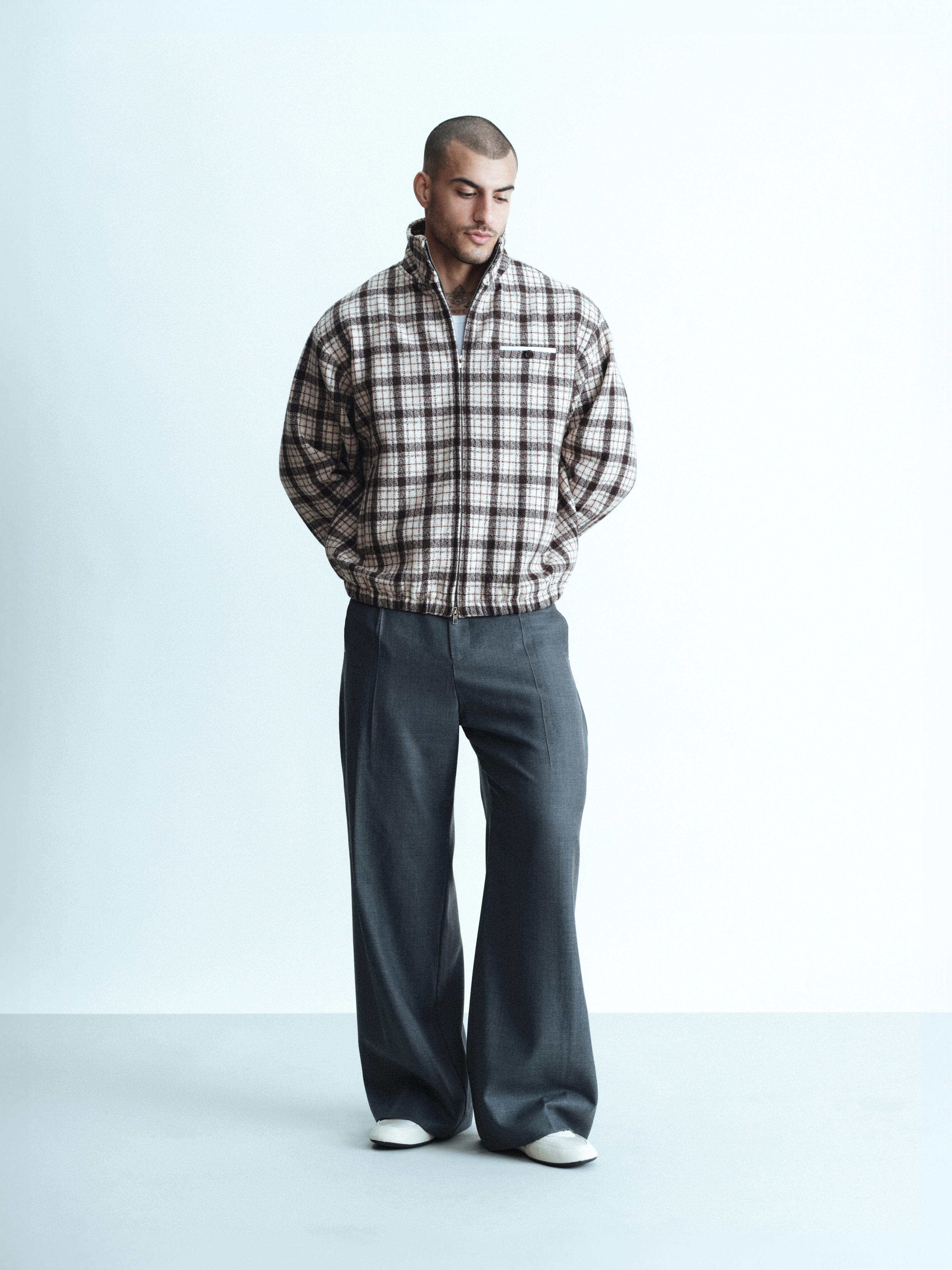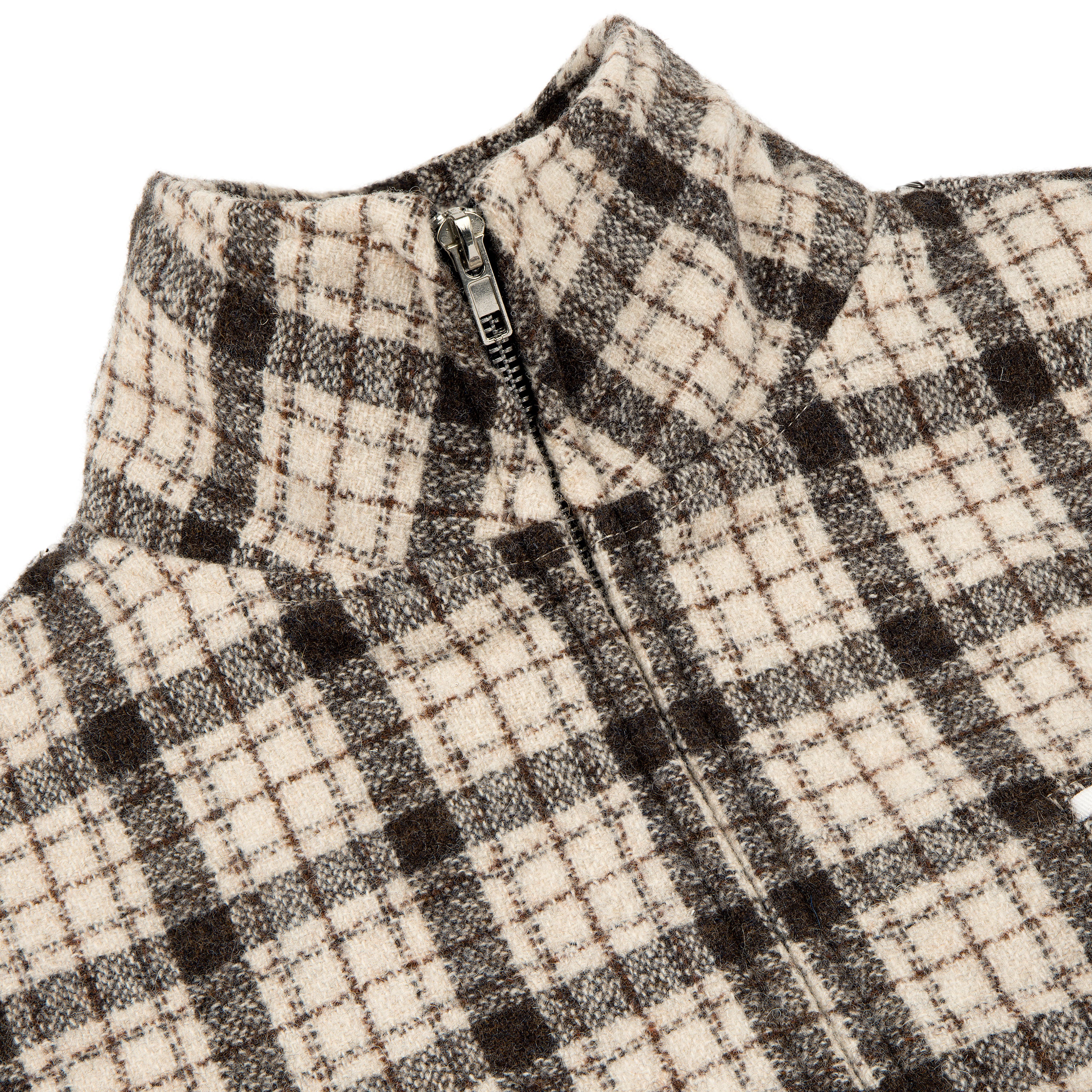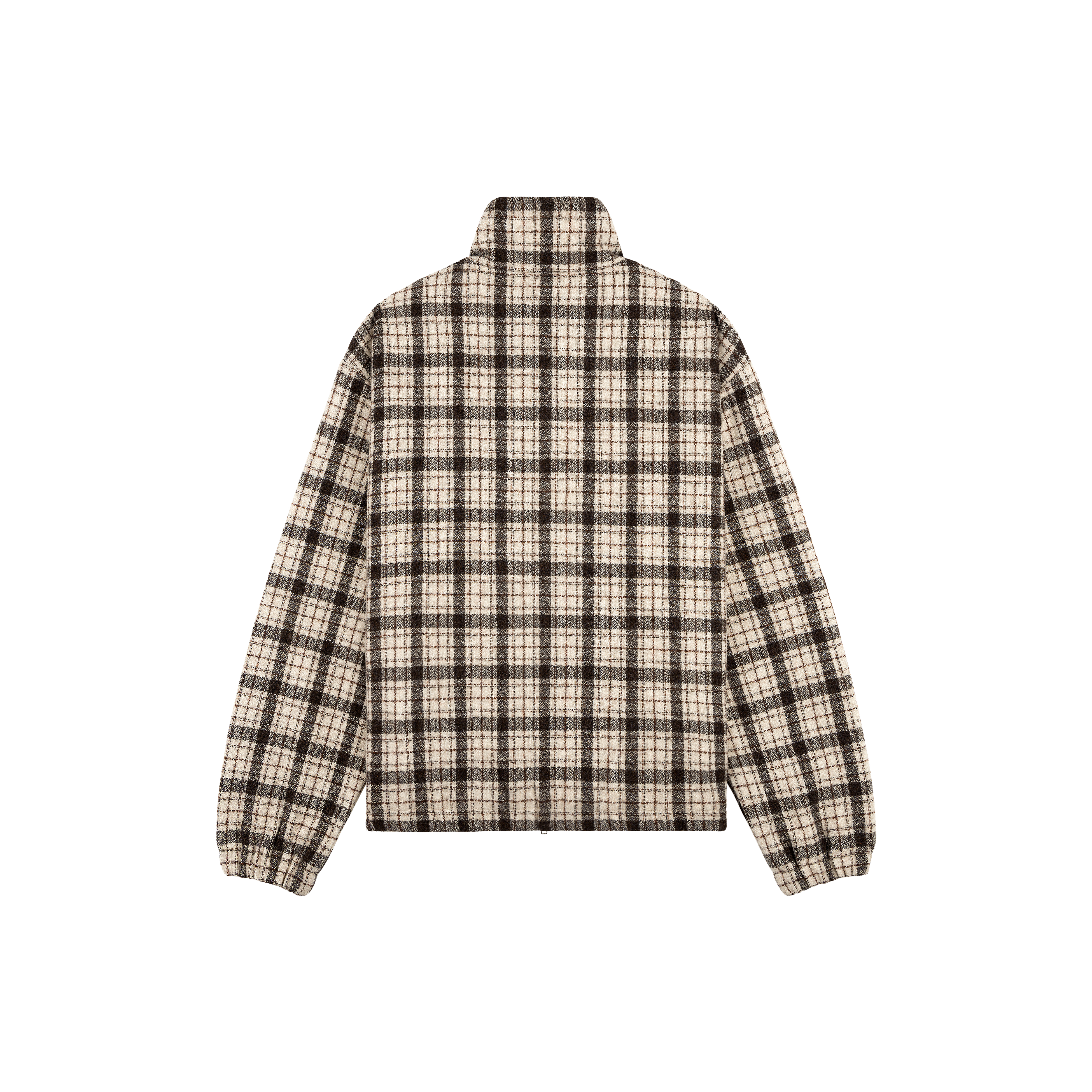 A 100% wool shell jacket in a tonal plaid, lined with a soft wool-viscose blend for a clean finish. Constructed with a double-layered collar, double-zip closure, elasticated cuffs and hem, two front pockets and a decorative chest pocket.