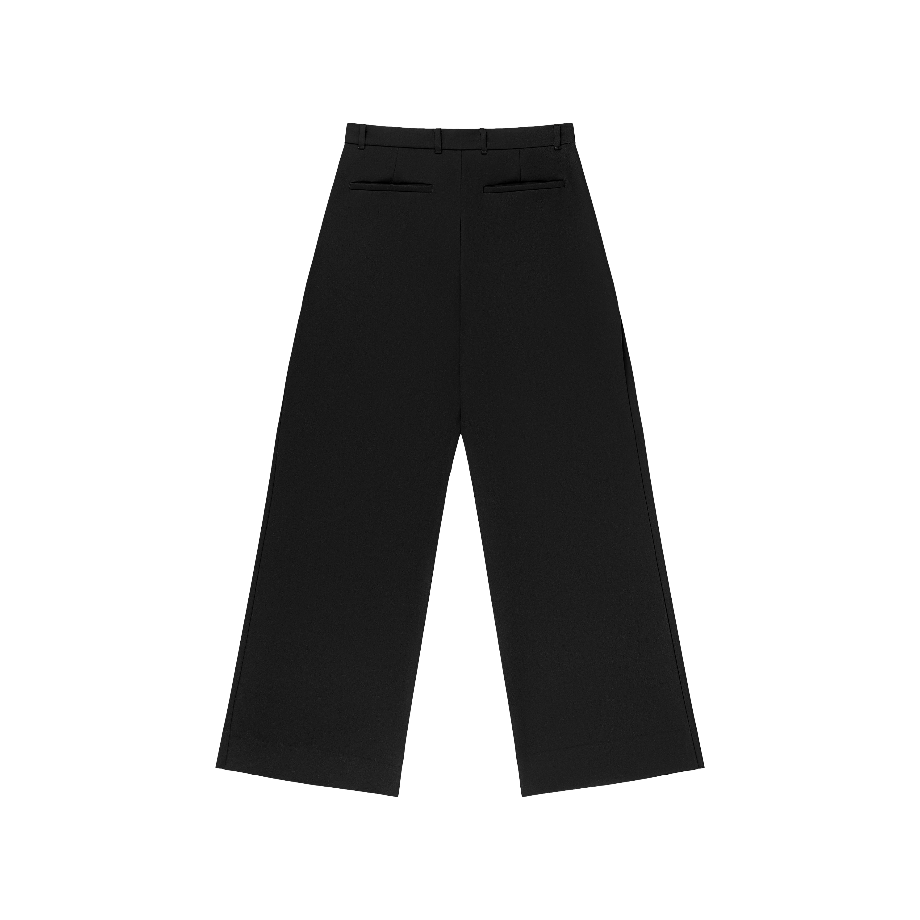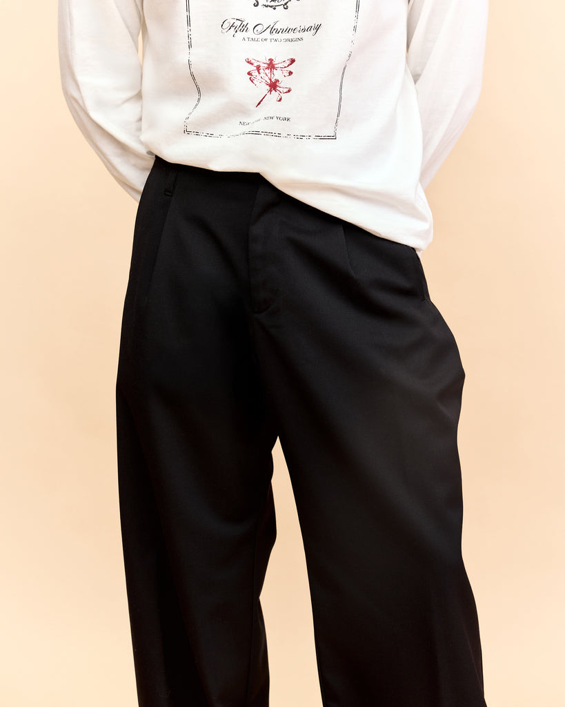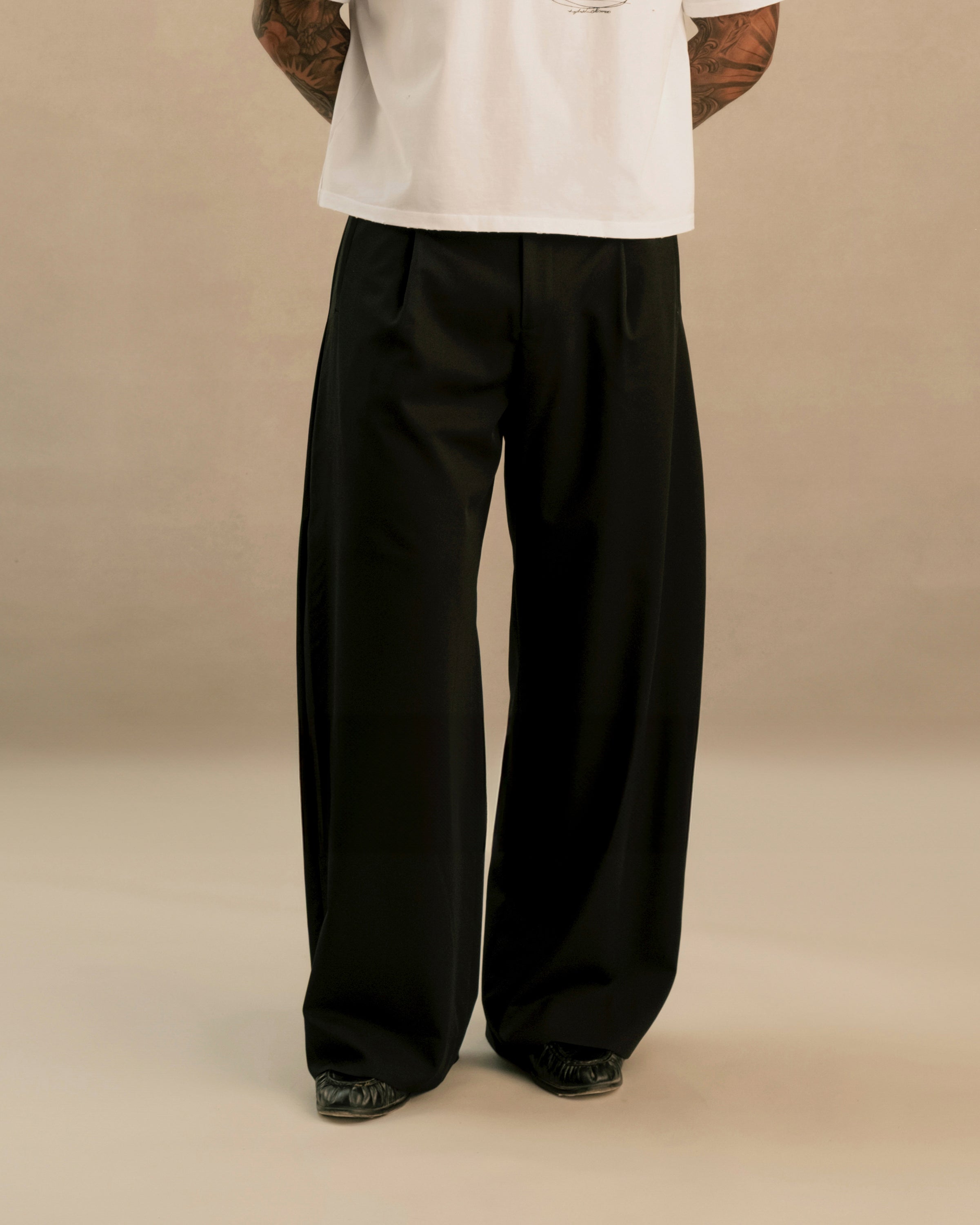 The wool pleat pants are a wide leg, relaxed fit pant with front and side pleats. Finished with a front zipper and custom JOSHUA MOHAMED main button. Constructed from 100% wool.