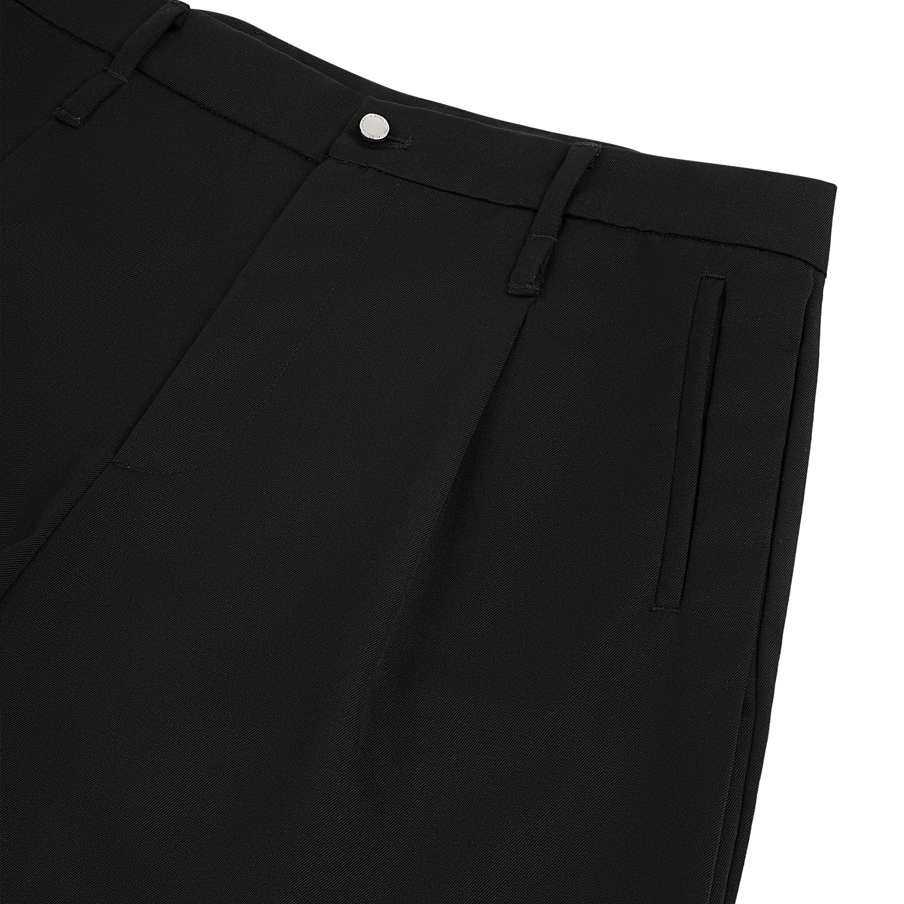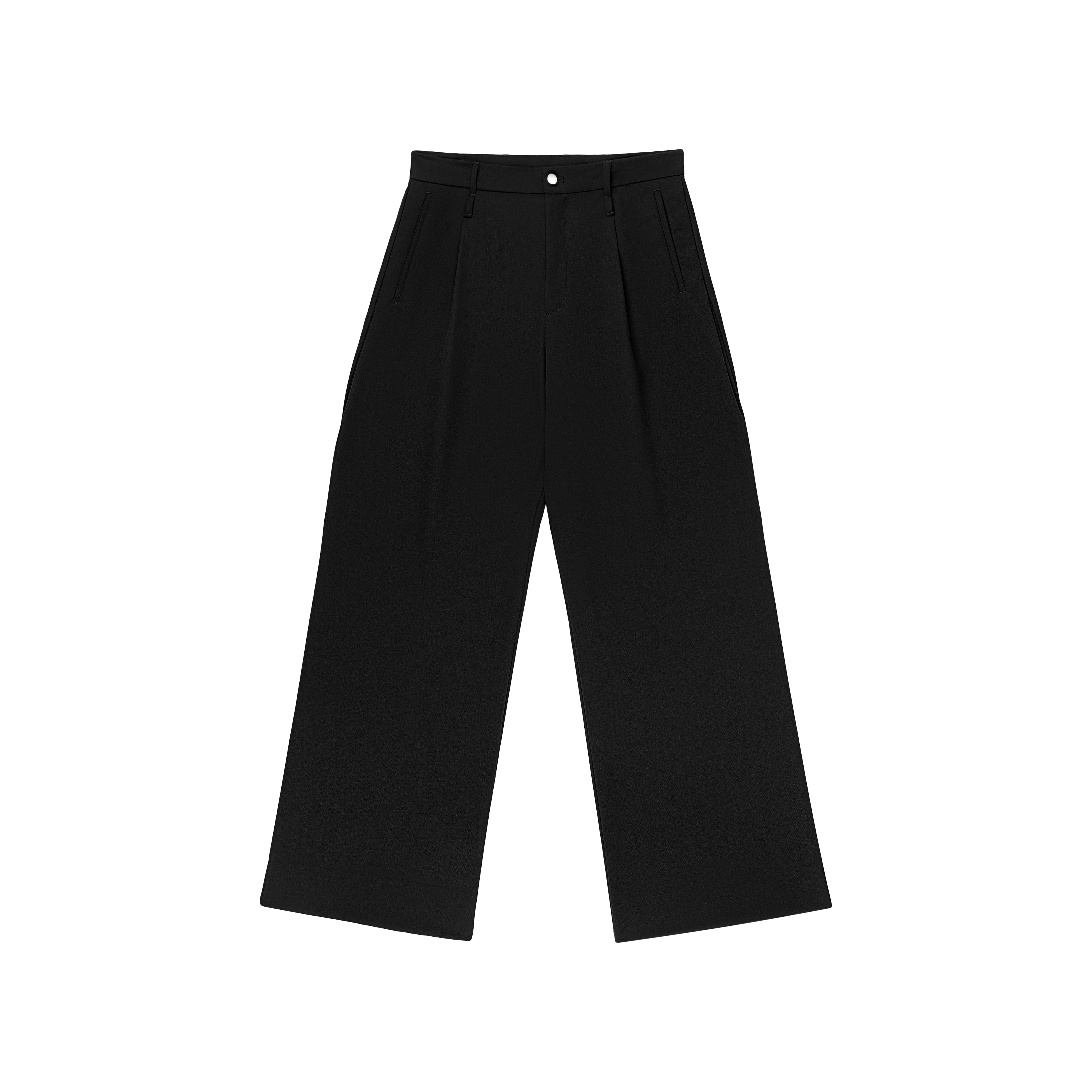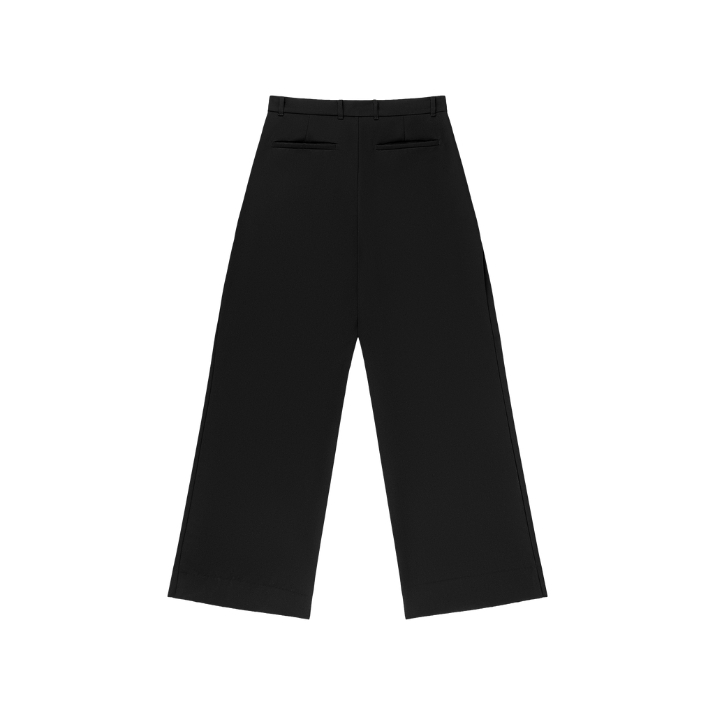 The wool pleat pants are a wide leg, relaxed fit pant with front and side pleats. Finished with a front zipper and custom JOSHUA MOHAMED main button. Constructed from 100% wool.