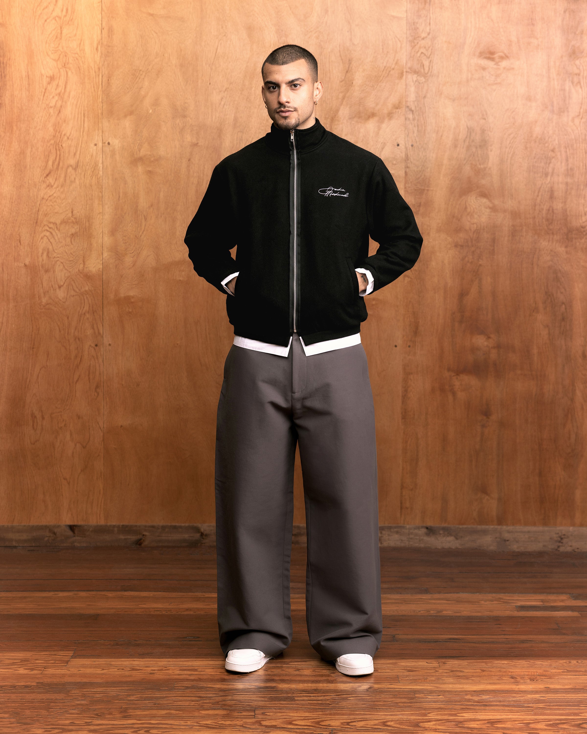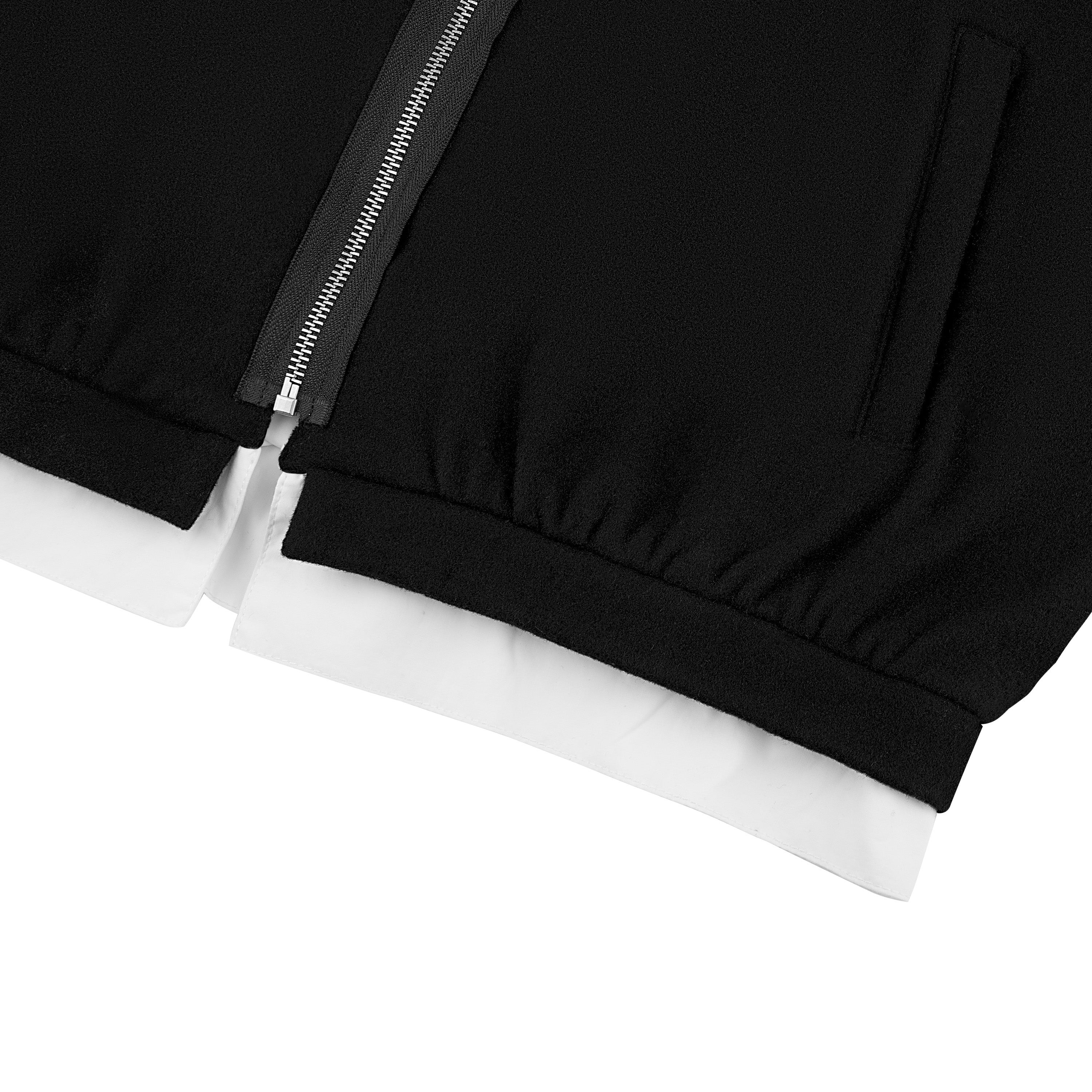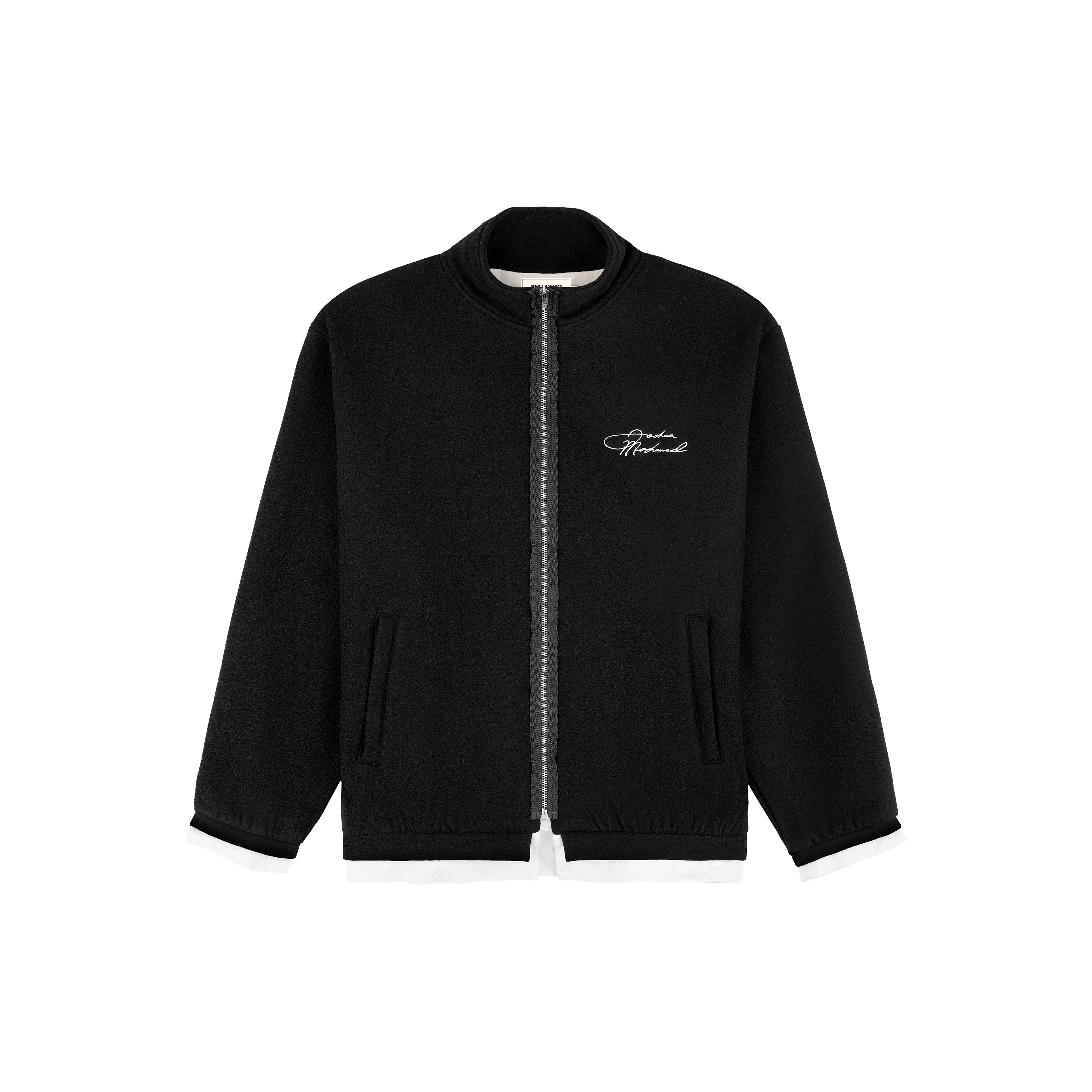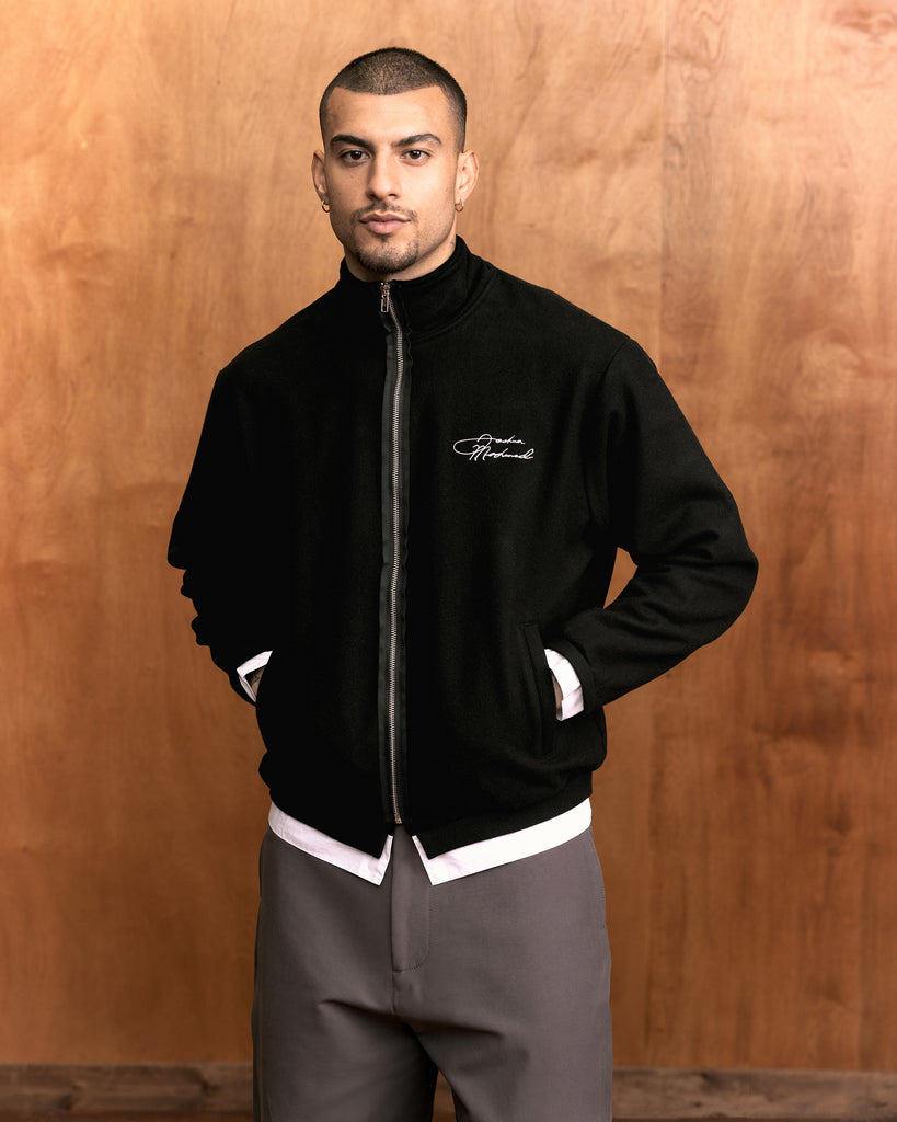 The wool zip-up jacket features an inside-out main zipper, embroidered artwork on the left chest, pockets with hidden zippers and an exposed white lining at the sleeve cuffs and hem. Lining: 100% cotton. Shell: 100% wool.