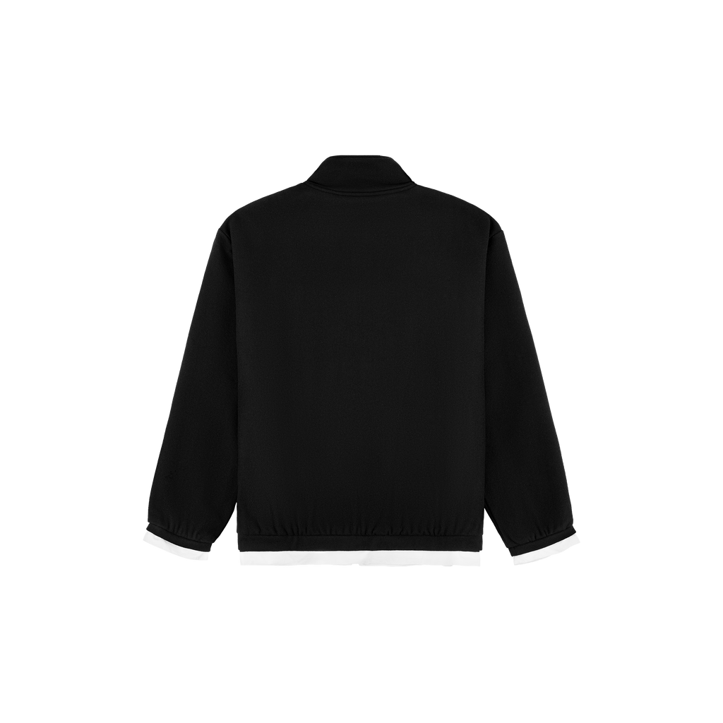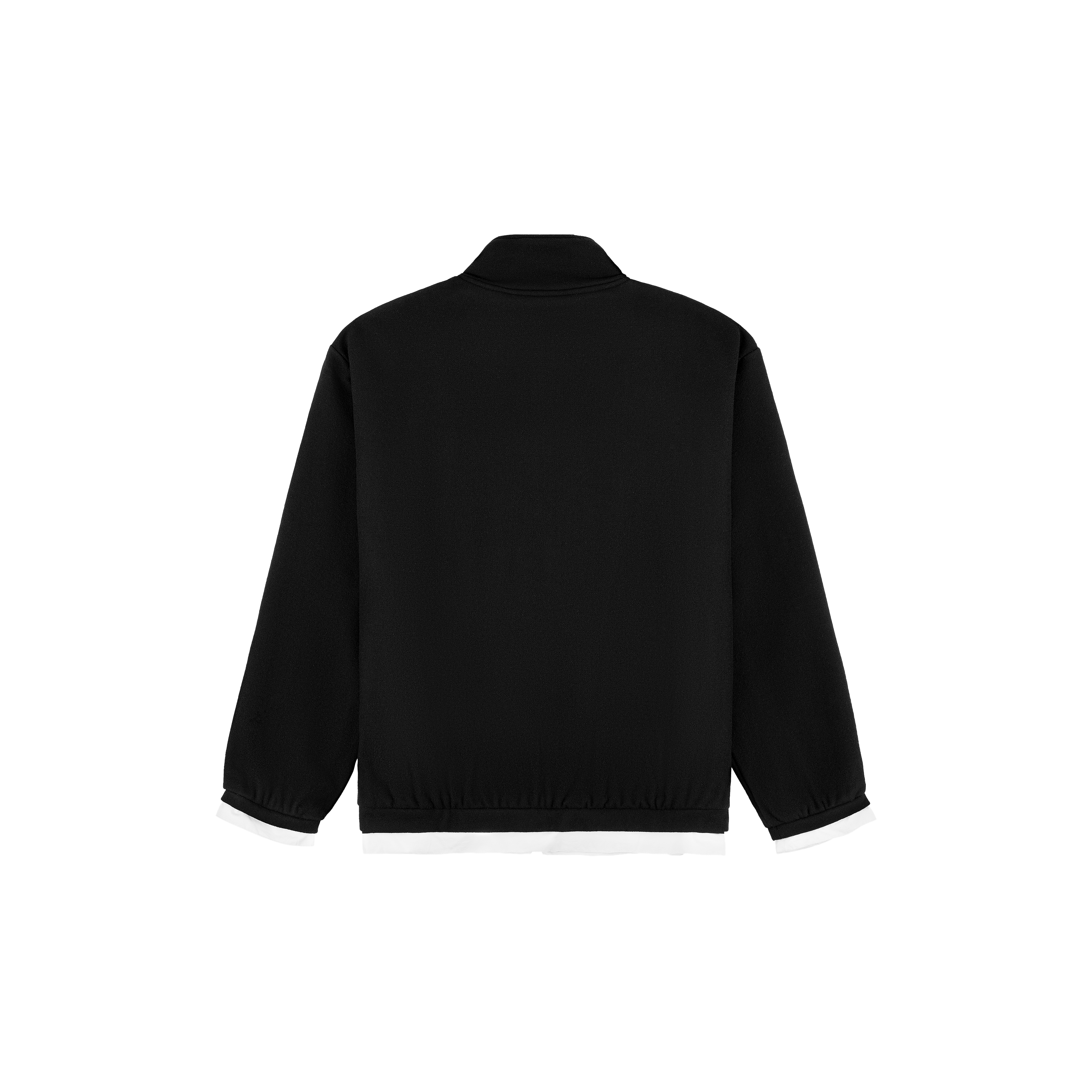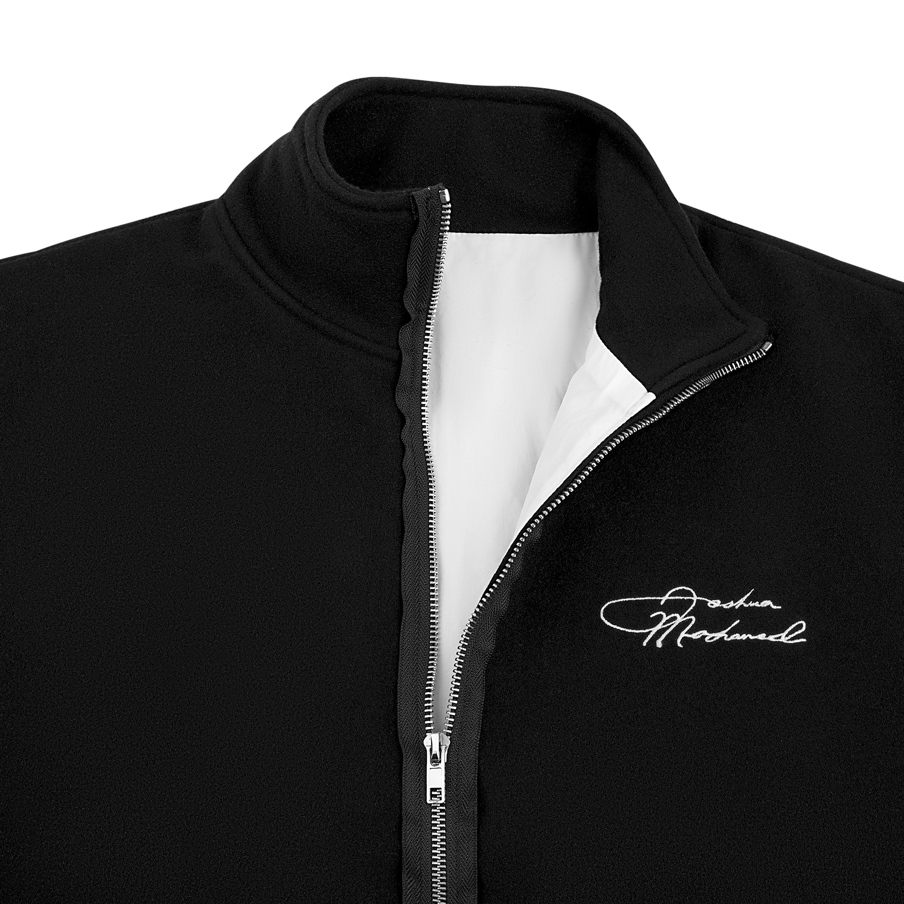 The wool zip-up jacket features an inside-out main zipper, embroidered artwork on the left chest, pockets with hidden zippers and an exposed white lining at the sleeve cuffs and hem. Lining: 100% cotton. Shell: 100% wool.